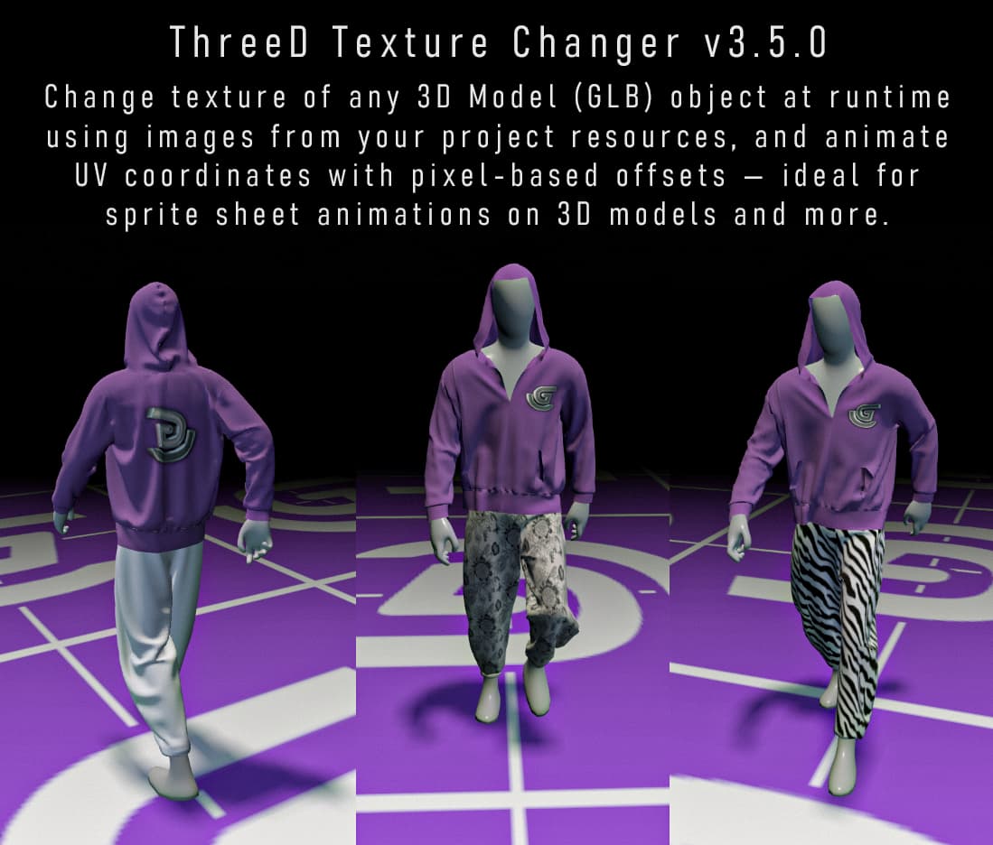 Hello, I have created a small extension that allows you to change and animate textures for GLB models. You can swap textures during gameplay by loading them from project resources, as well as offset their UVs. This will help you not only create different versions of your objects with different textures, but also various effects, including full-fledged sprite sheet animations on 3D objects.