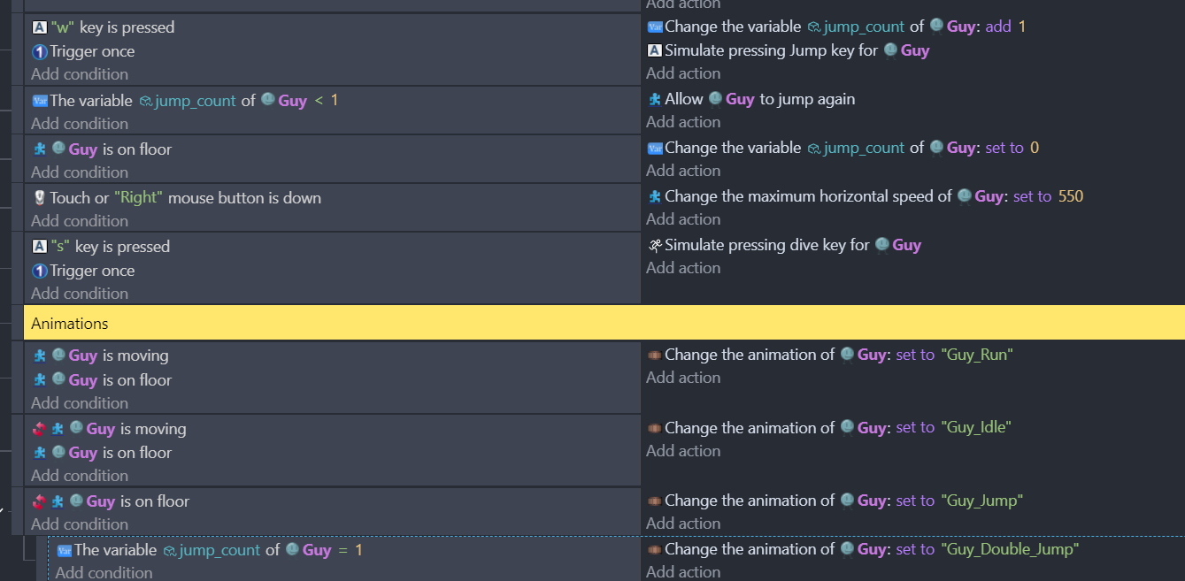 I am making a game that has a double jump jump mechanic and I want the character to have two animations for the first jump and the second jump like Ms. Chalice from Cuphead. The problem is the first jump animation is playing just fine however the second jump animation is stuck on the first frame. Here’s the code.