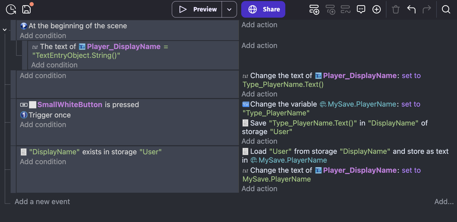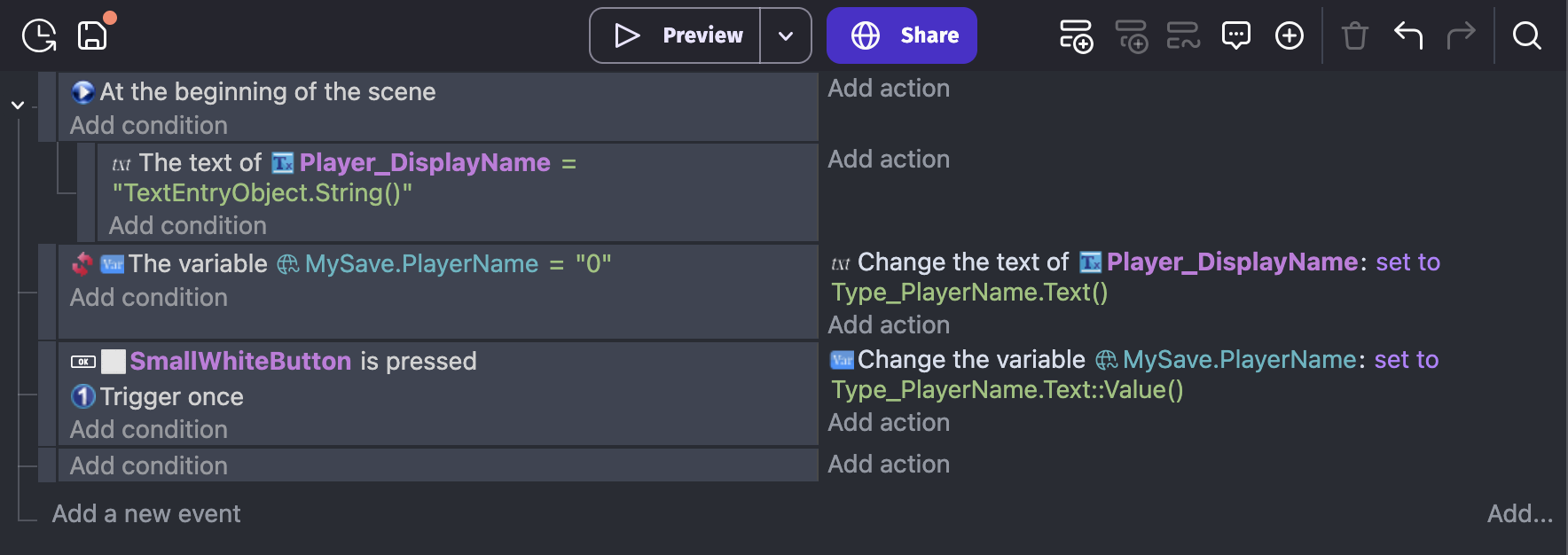Change global variable value and set to the name of your TextInputObject (in my case Type_PlayerName)