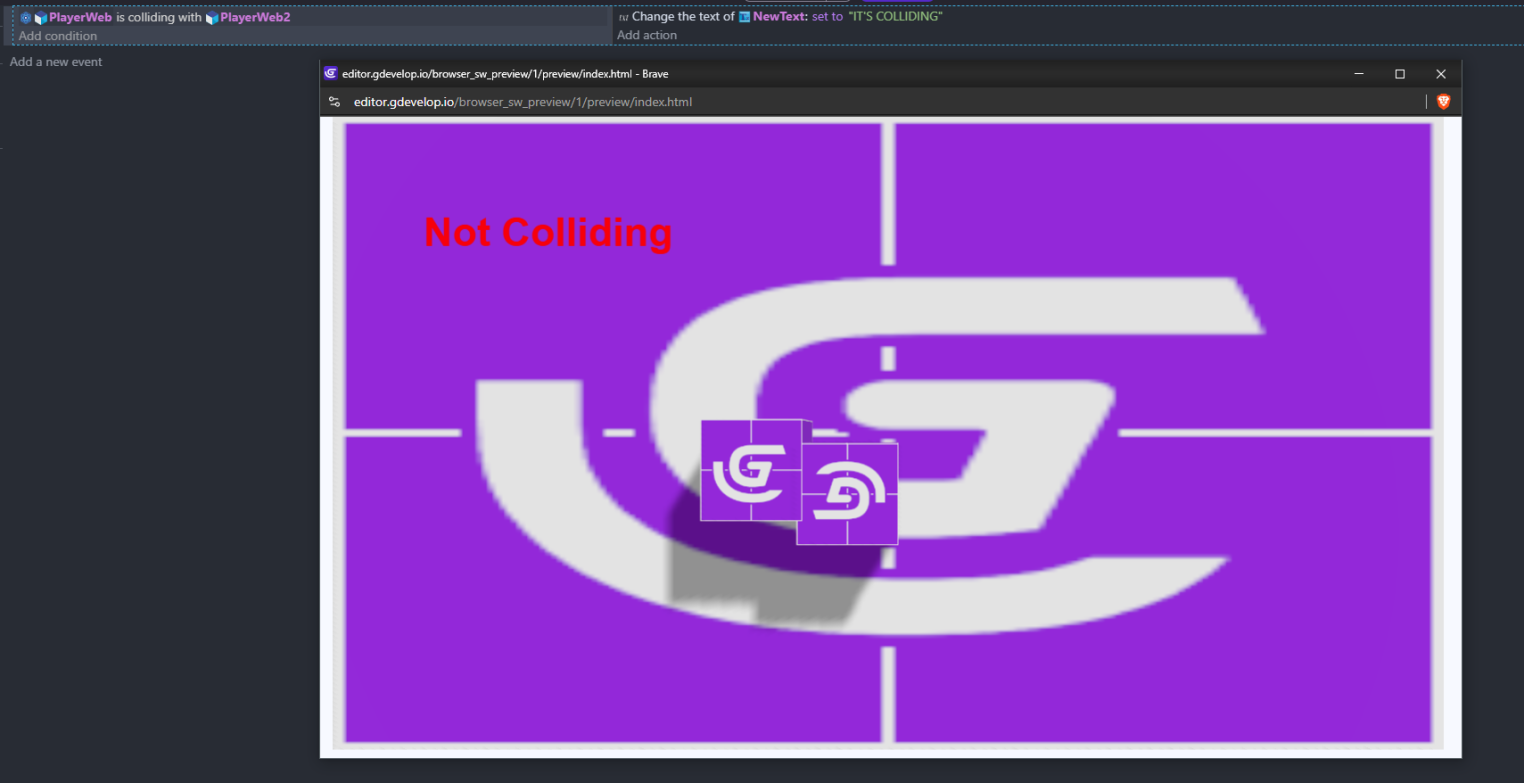 - In the events sheet, check if your moveable box is colliding with the other. If so, have it set the text of the Text object to “It’s colliding!”