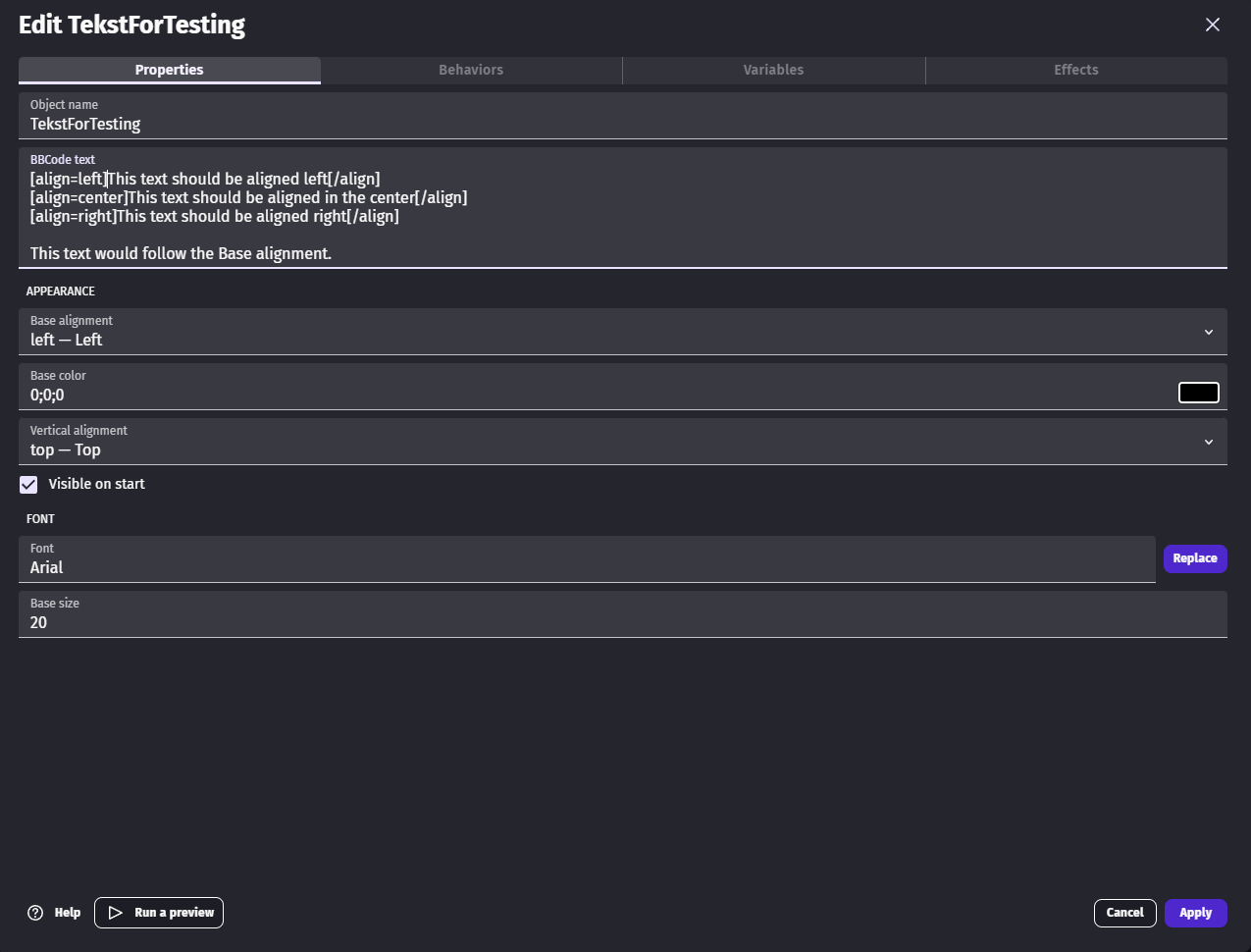 When using the code : * [align=center]text that is centered (you can also use left and right)[/align] as described here : BBText - GDevelop documentation it does not work. The base alignment of the object seems to overule it.
