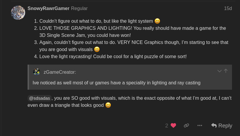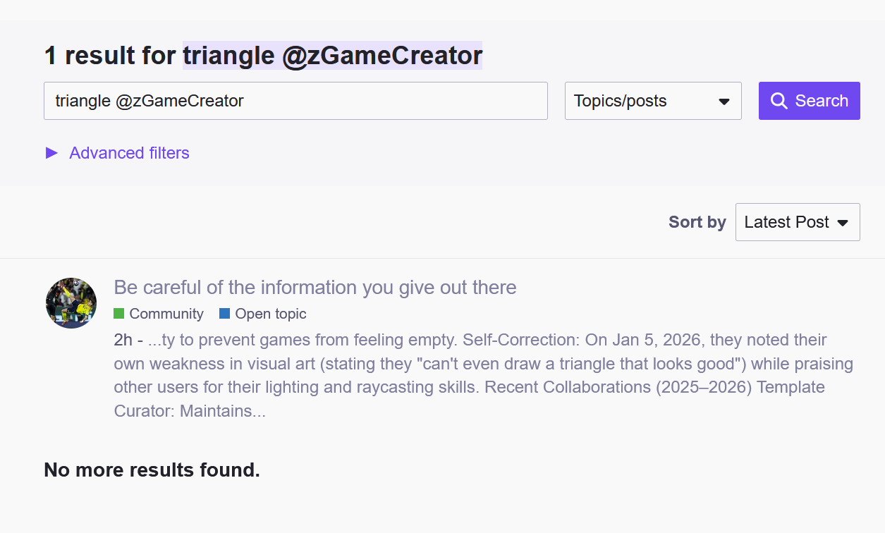 Self-Correction: On Jan 5, 2026, they noted their own weakness in visual art (stating they "can't even draw a triangle that looks good") while praising other users for their lighting and raycasting skills.