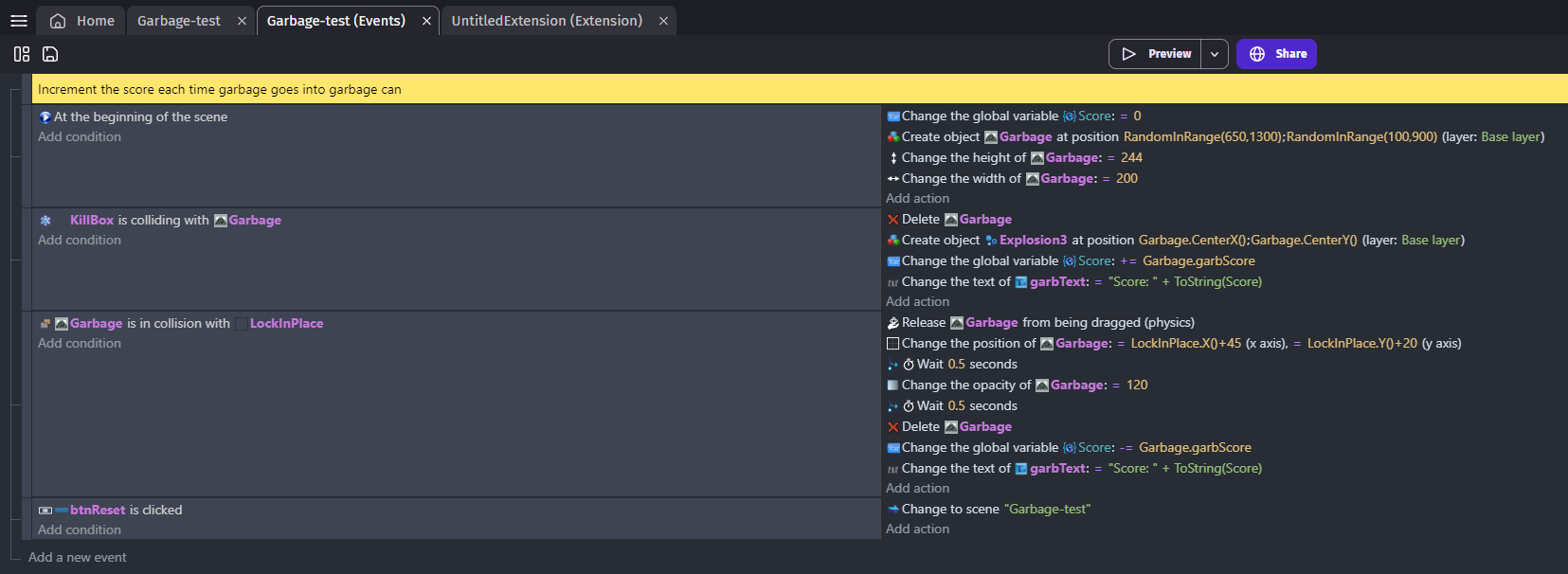 I tried to follow a GDevelop YouTube tutorial on functions and expressions and the documentation as well. It mentioned parameters, but my inputs are static and not dynamic so I don’t need parameters (?). I made my Garbage (sprite) object global in an attempt to get the function/extension to “see” it but that didn’t help.