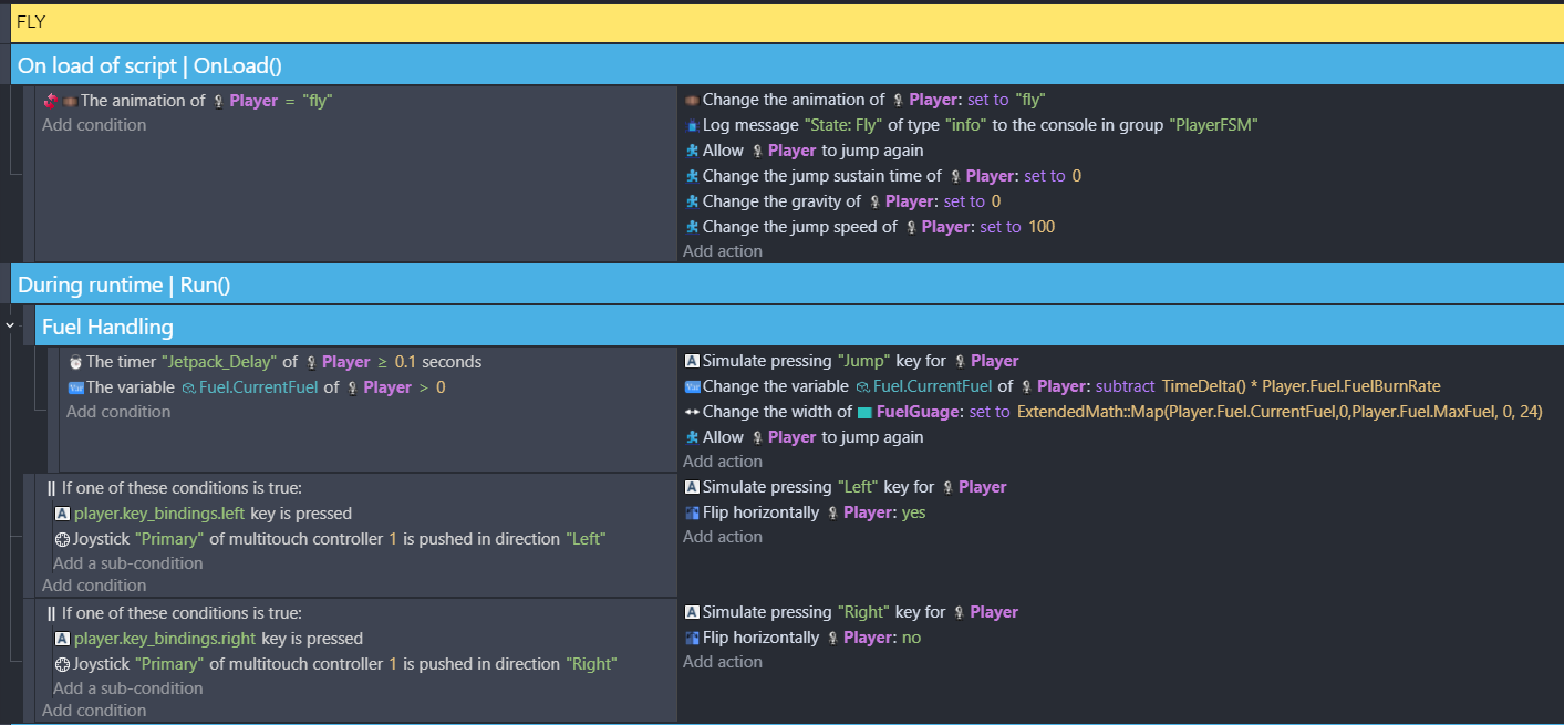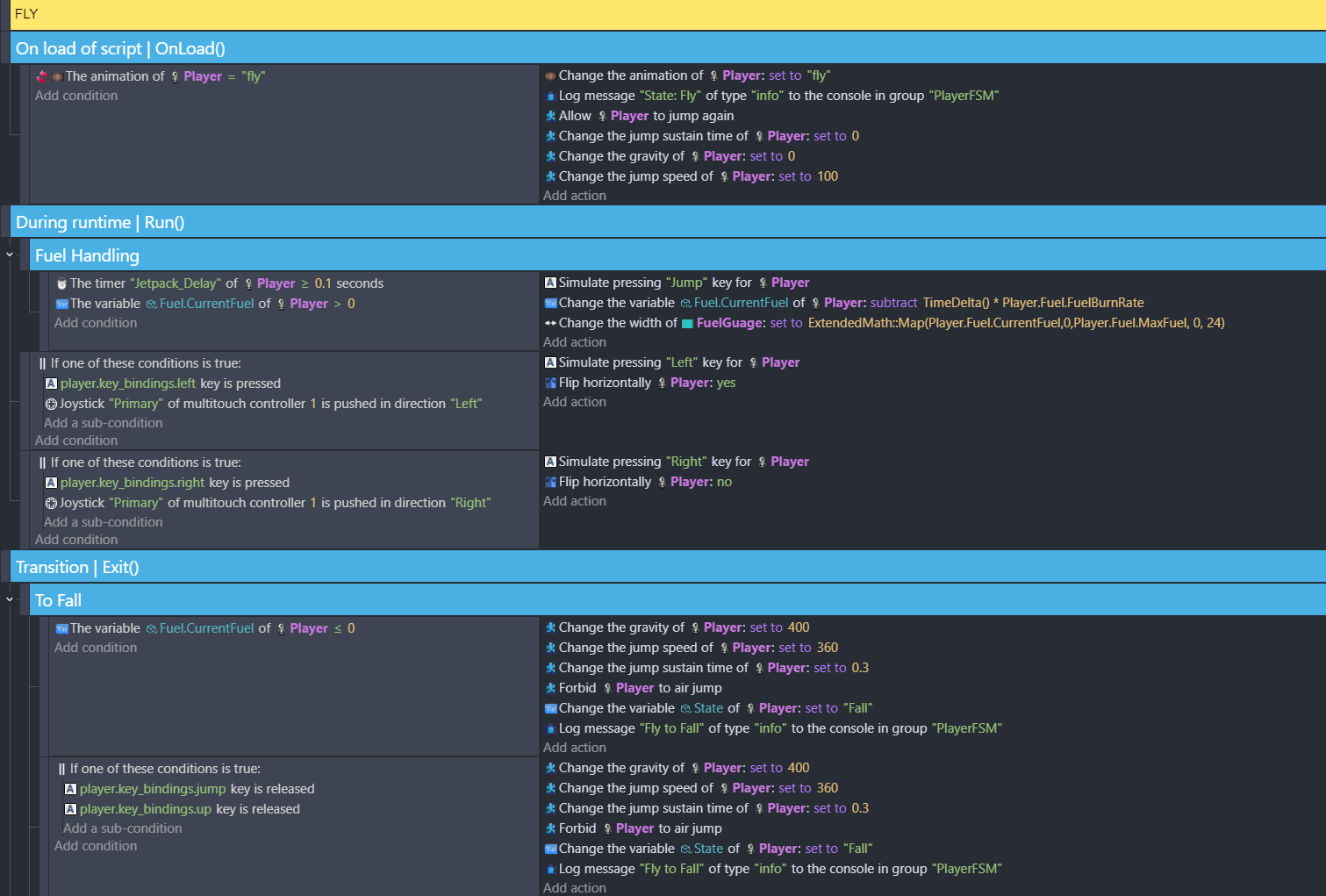 I’m using the platformer behaviour to control my character. I want to be able to have them jump, and then transition to flight. This is all working fine, they can enter and exit flight at the right times through the use of a state machine.