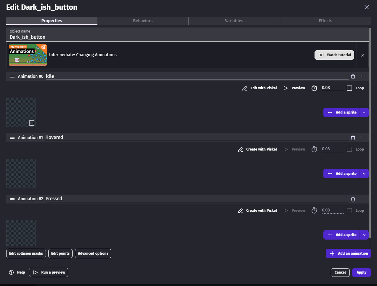 Scroll down a bit — you’ll see properties like Idle, Clicked, and Hover. They won’t have any images set.