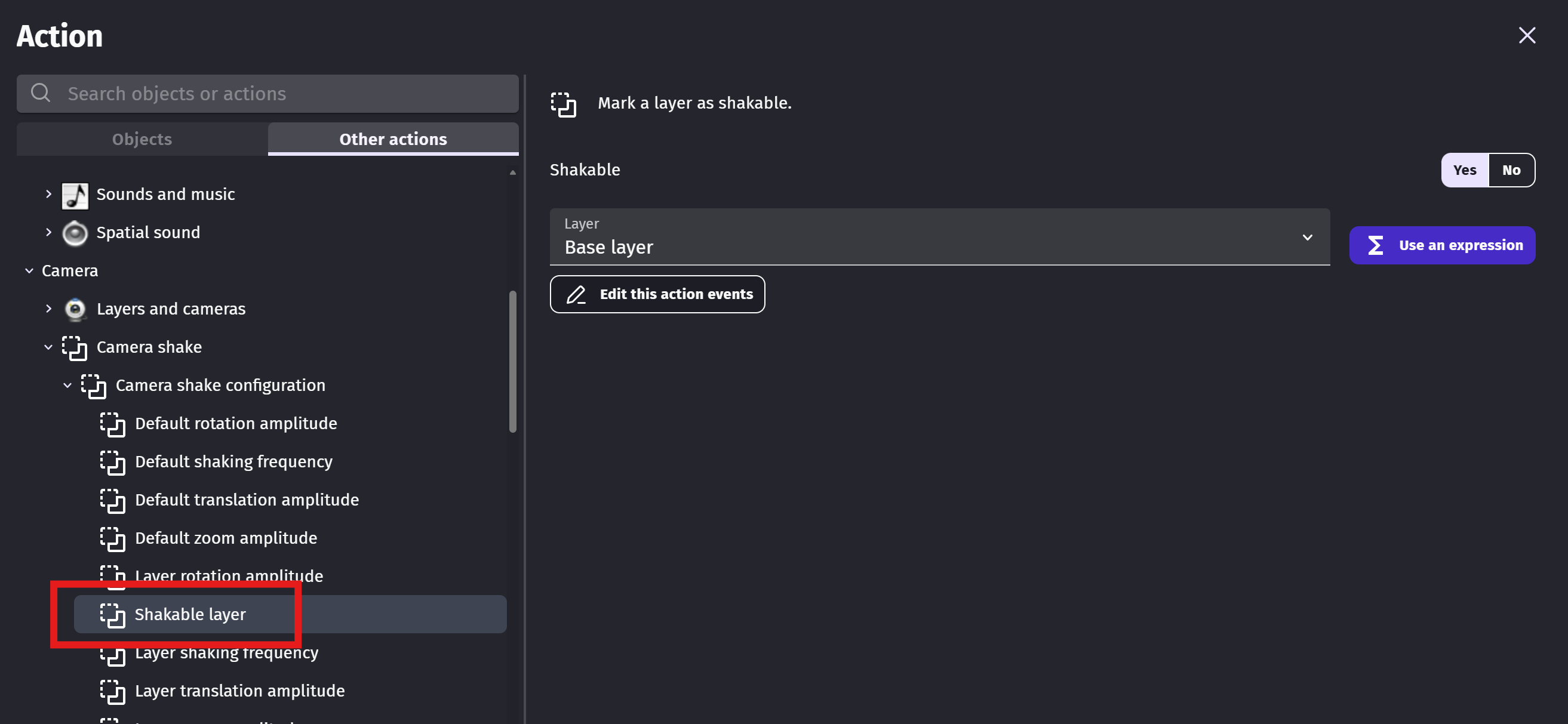 Shakable layer Mark a layer as shakable. https://wiki.gdevelop.io/gdevelop5/extensions/camera-shake/