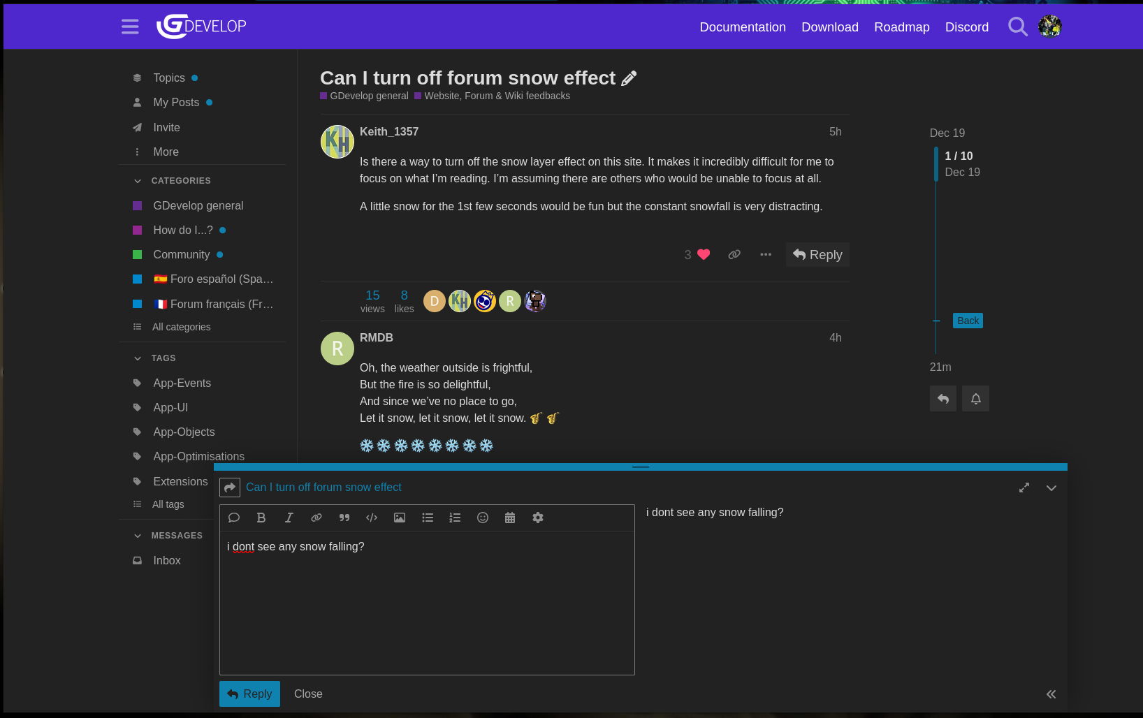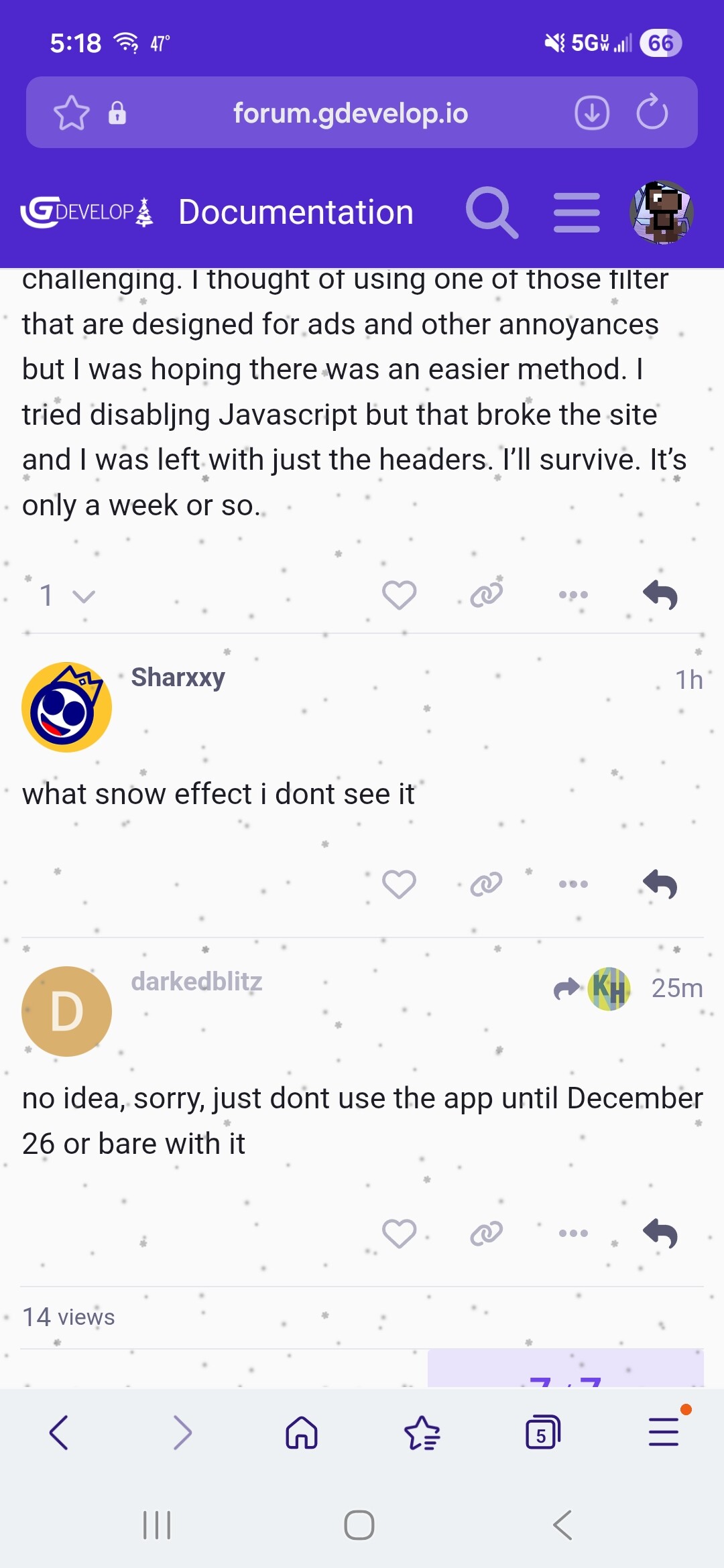 Is there a way to turn off the snow layer effect on this site. It makes it incredibly difficult for me to focus on what I’m reading. I’m assuming there are others who would be unable to focus at all.
