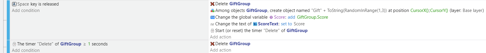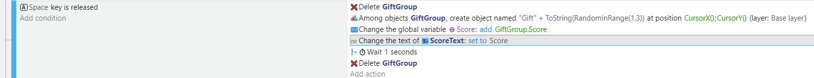 There’s a problem though. If multiple gifts are added before the previous one was deleted then the object would be deleted but the wait event would still trigger after 1 second. So, the previous wait and delete action might delete it first. IDK if that makes sense.