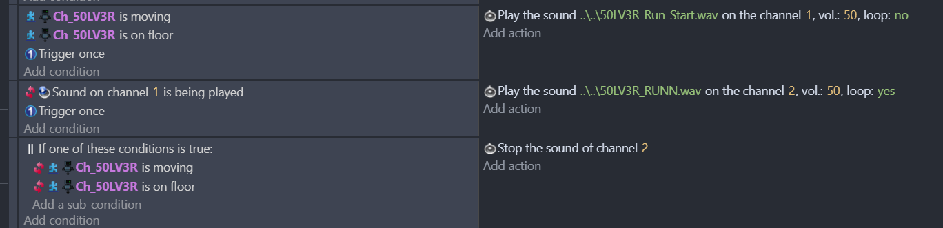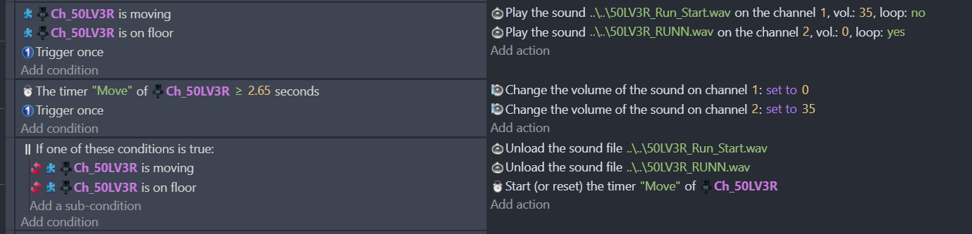 So i’ve just started to work on the sounds on my game and have 2 different sounds for my character. First the wind-up sound when the character starts moving and then a second sound that’s a loop that’ll continue playing as long as the character is moving.