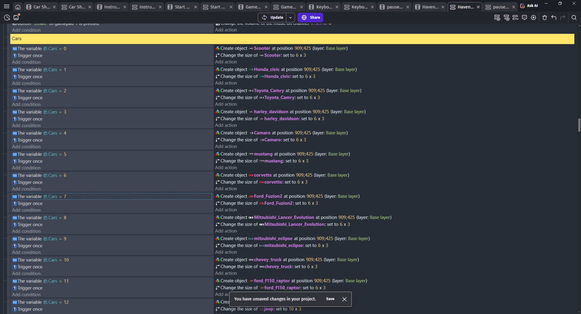 Among objects CarGroup create object named CarArray[Cars] at X, Y