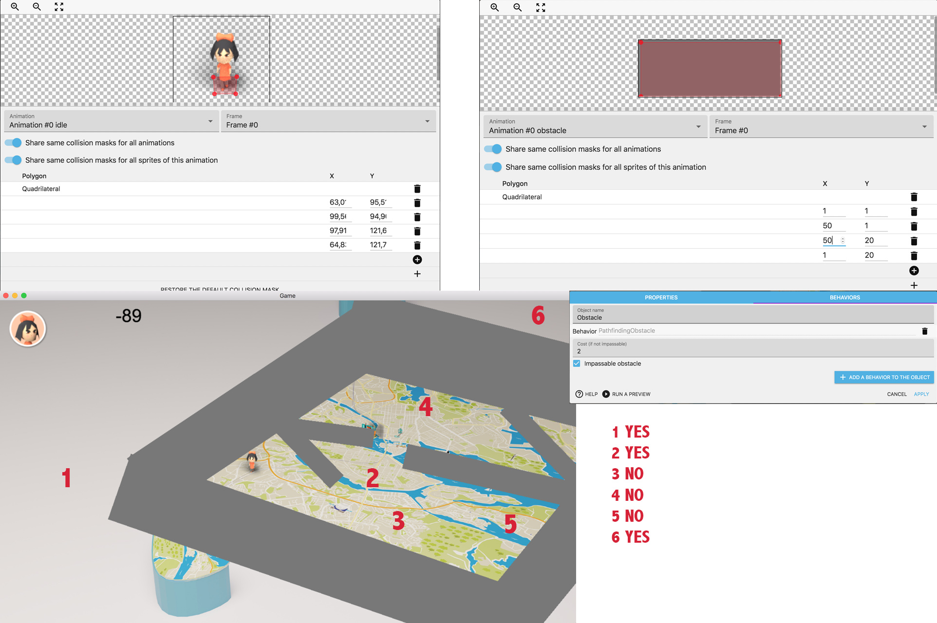 I have one theory tho. I have scaled down Minda from her original size. I tried to reproduce the project with random graphics made in Piskel and they had the same proportions. That worked better. Also it seems as if the Collision behaviour doesn’t recognise if I rotate the obstacles. The collision area seems to be the same regardless of how I rotate the object. BUT this is only true if I use the Pathfinder. When using TopDownMovement and the collision action and moving Minda with the keyboard it seems like collision works as it should. Even when I rotate the obstacles. Any comments on that? Am I missing something? I did read that custom hitpoints wont work with html5, so I am not using that anymore.