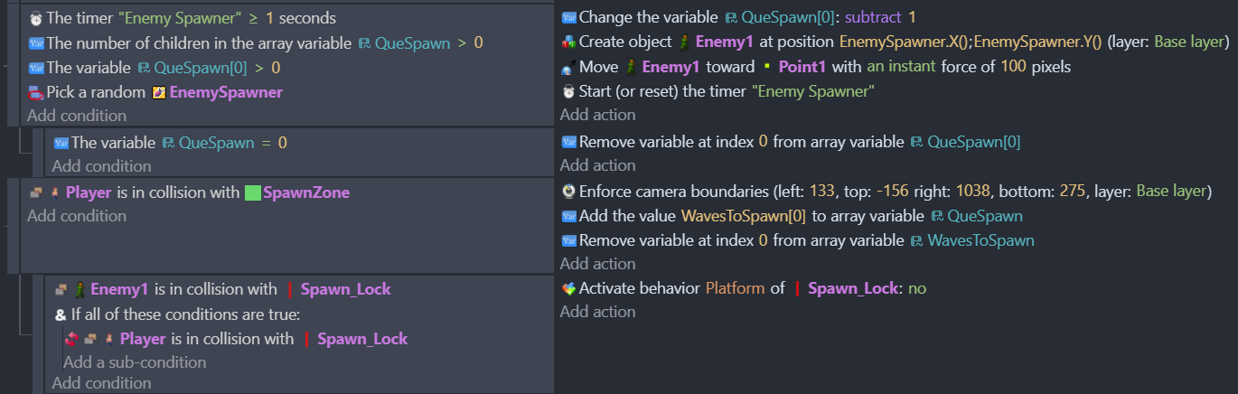 So I am also trying to setup waves of enemies. I was able to get the first wave to spawn but it’s not updating the ‘QueSpawn’ with the array from ‘WavesToSpawn’. I was reading above and this is clearly over my head. I couldn’t even create the same conditions listed above. Can anyone help me? Here’s my arrays: