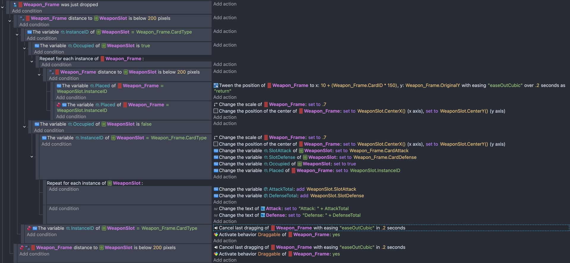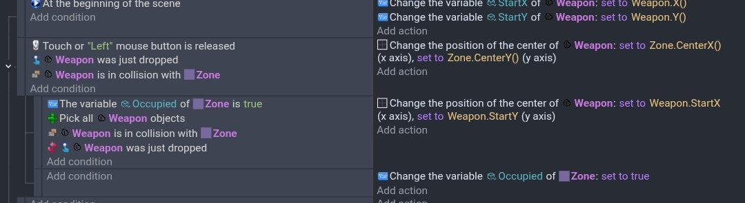 This is something fundamental about GDevelop that I’m just not getting yet. How to nest conditions to execute something like this. My instinct is to tag the previously dropped weapon with a variable and then move it using that tag. Then apply that tag to the newly dropped weapon.
