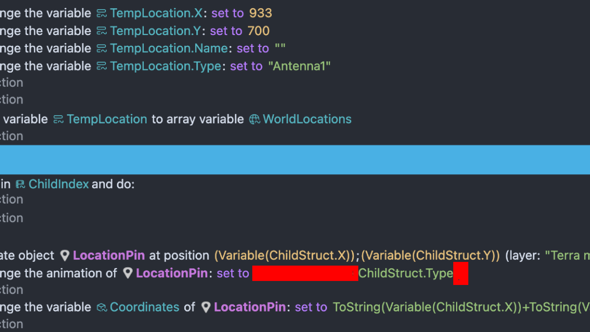 What the screenshot does (or almost does) is storing text and/or number variables in a local structure-variable, sends that structure to a global array index (WorldLocations), through ChildStruct it creates a pin on the coordinates of the canvas and changes the animation by name of that pin from the .Type of that location.