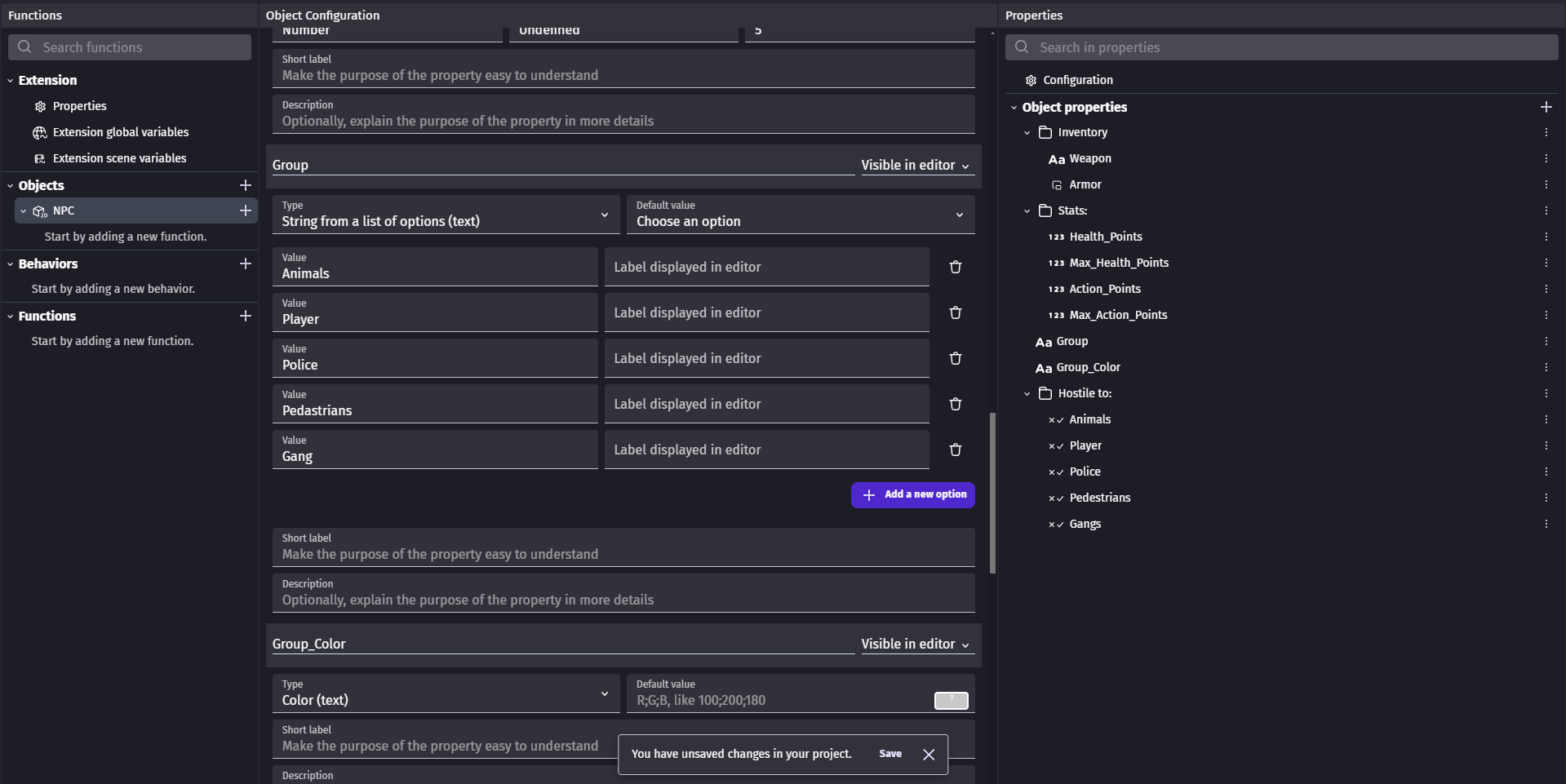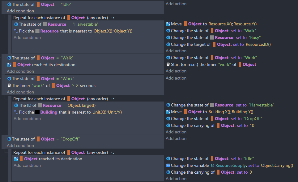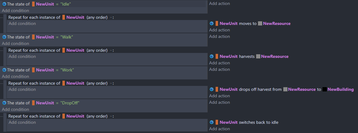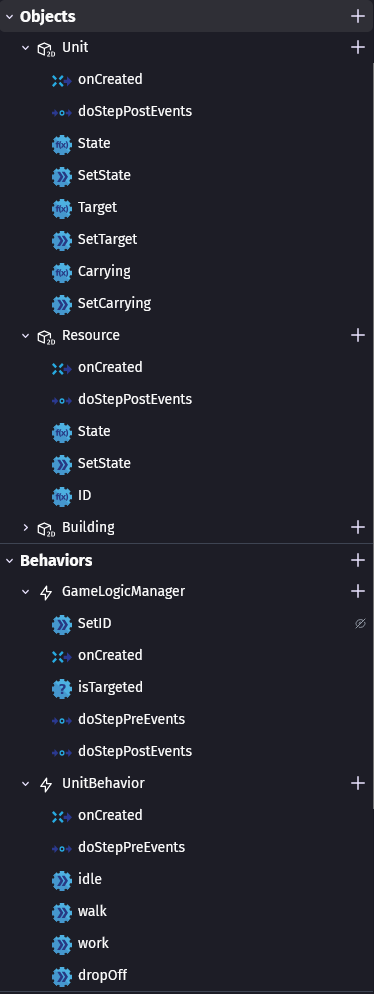 Now, using an Custom Extension for the Unit AI Behavior is giving me an headache. It is not too hard, to manage the whole StateMachine/UnitAI in the classic Events Sheet, but I want to learn how to do it in a Custum Extension. I can’t get my head around, how to approach it… If it is useful at all, to ecapsulate it in a modular system… If and how to split it in CustomObject logic, ObjectBehavior logic and CustomFunction logic…