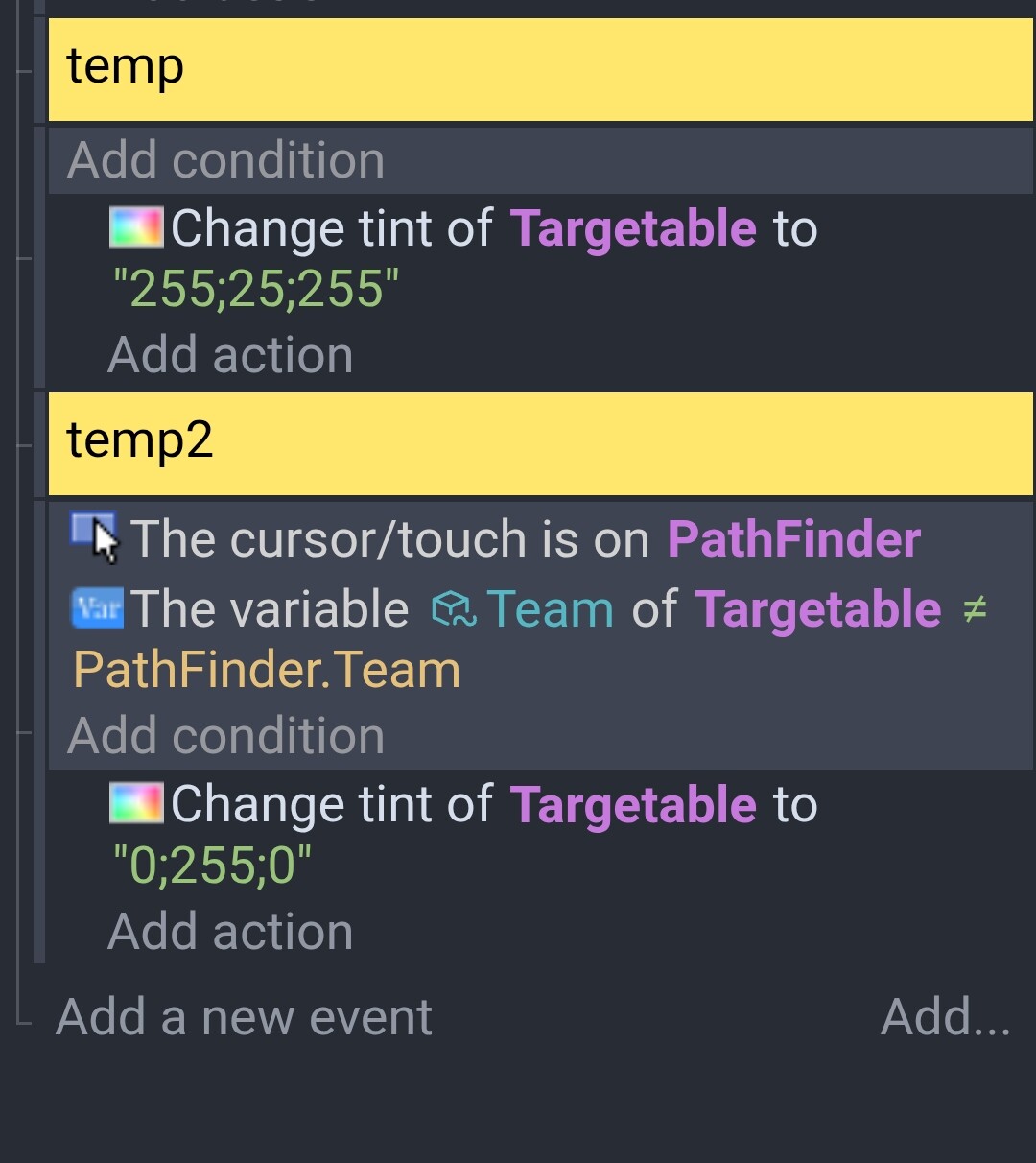 hi, I am new to GDevelop. I am trying to make a custom targetting system for my AI which uses team stats, but it does not work.