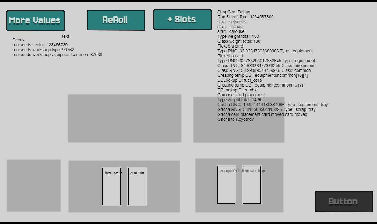 The Workshop is where the player will purchase upgrades between runs. It can now generate equipment and gacha cards, select their type and rarity and place them in the correct areas of the screen. The equipment will respect rules around not showing duplicates of existing equipment.