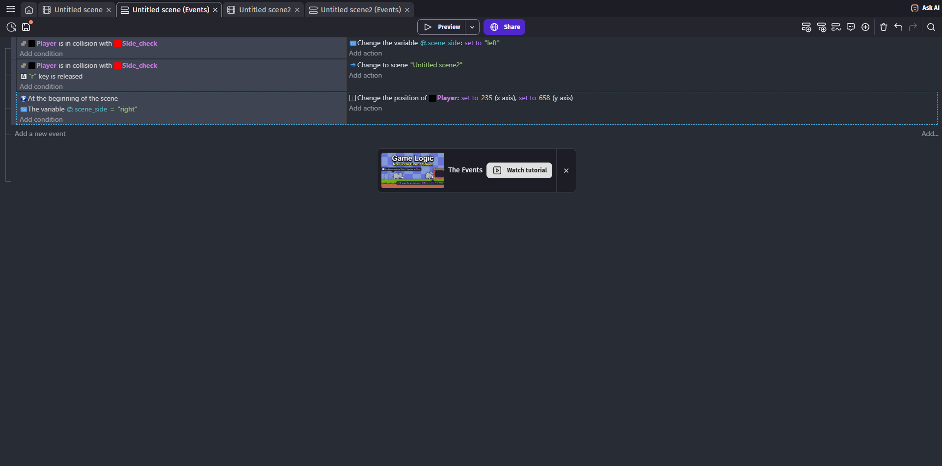 you can use an event to check what side of the screen the player is on then change a global variable that stores that information and transports it between scenes, then add an event that check that variable at the start of the scene and puts the player in the correct position, unlike in my example you don’t have to use collision to do the check, just as long as it accurately tell you what you need to know.