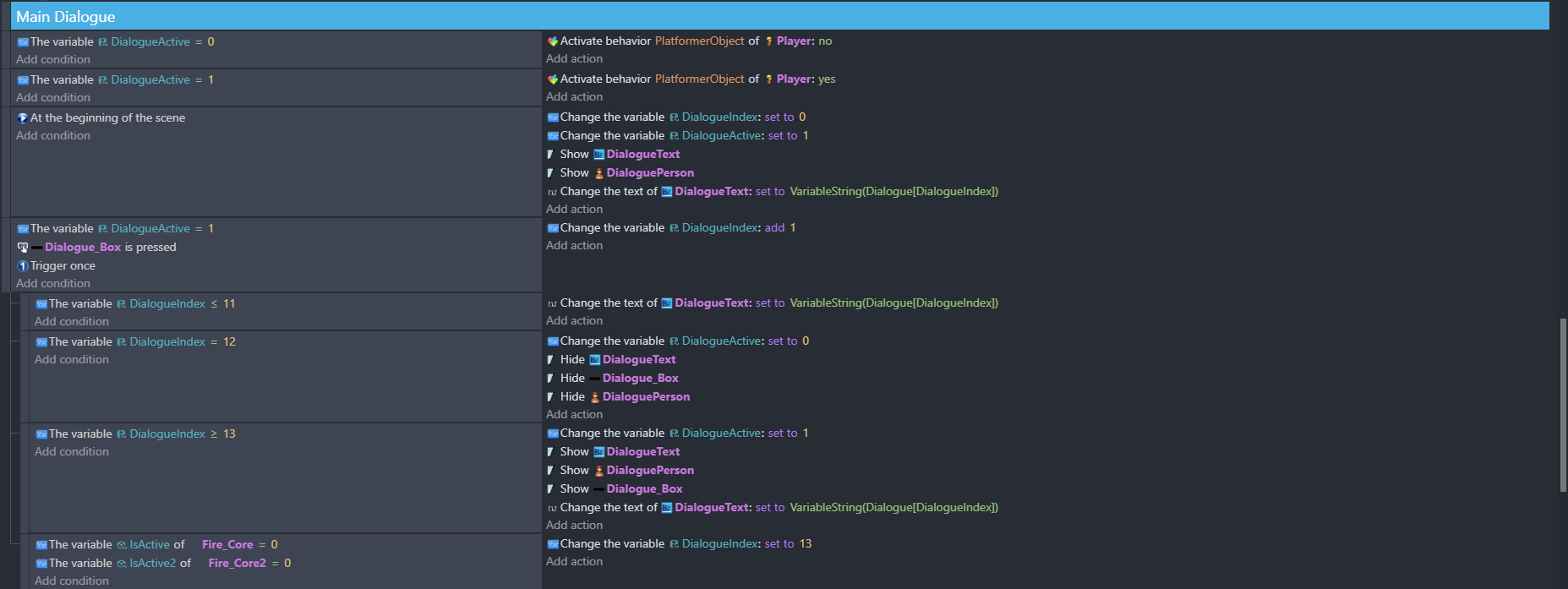 At DialogueIndex = 12, I pause the dialogue so the player can extinguish two fires. I set DialogueActive = 0 and hide the dialogue UI.