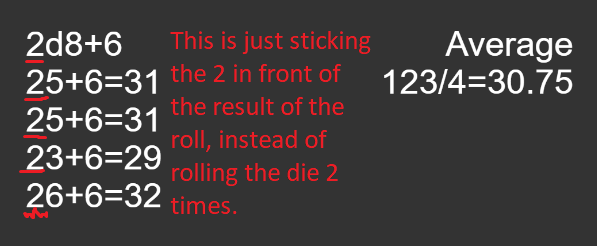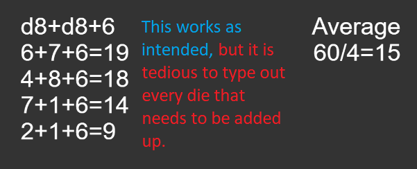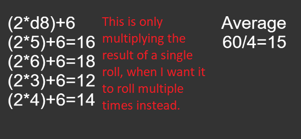 Also, strings like “2*d4” will only have that single “d4” string be replaced by a random number from 1 to 4, which then gets multiplied by 2, when what I actually want is for the d4 to be rolled twice and added together.
