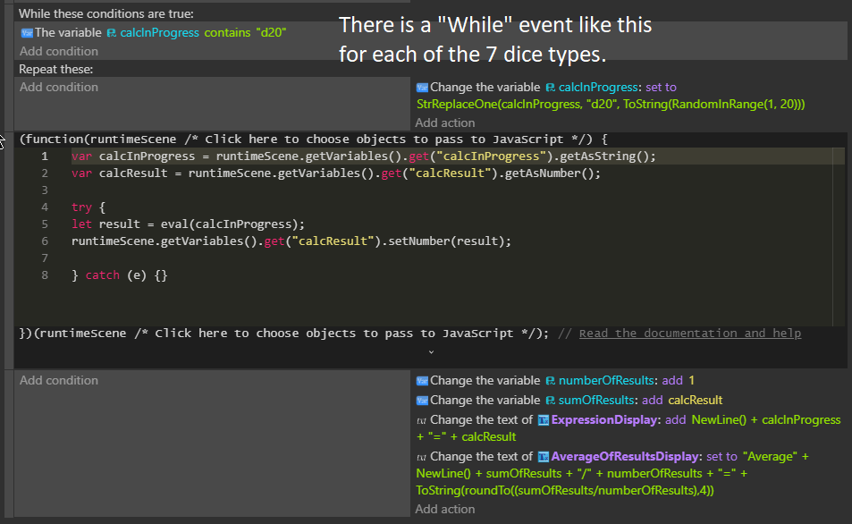 Right now I have events checking for the names of each die in the expression string (when I say “expression” I mean in the mathematical sense, not gdevelop expressions) and replacing them with random numbers in the corresponding range, then using a simple little javascript code block to evaluate the expression and send the result out to a scene variable, which the next events use to display the result.