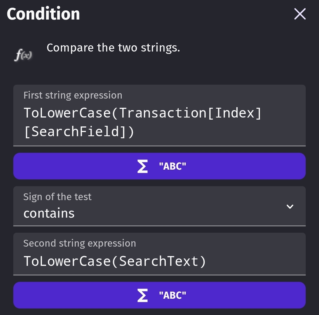 To use the ToLowerCase() expression, you need to use compare 2 strings condition instead of the variable condition .
