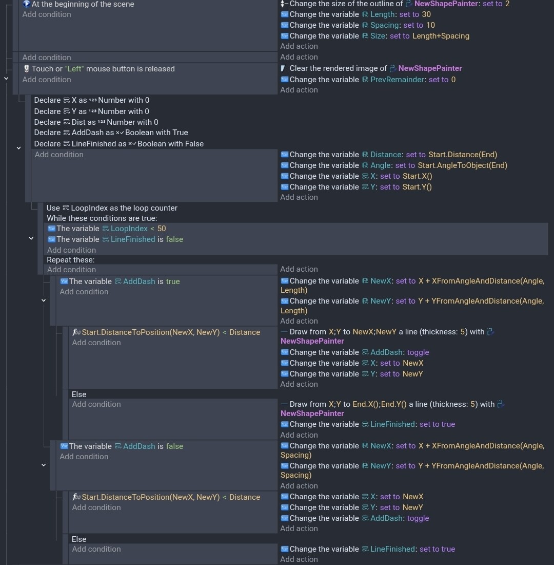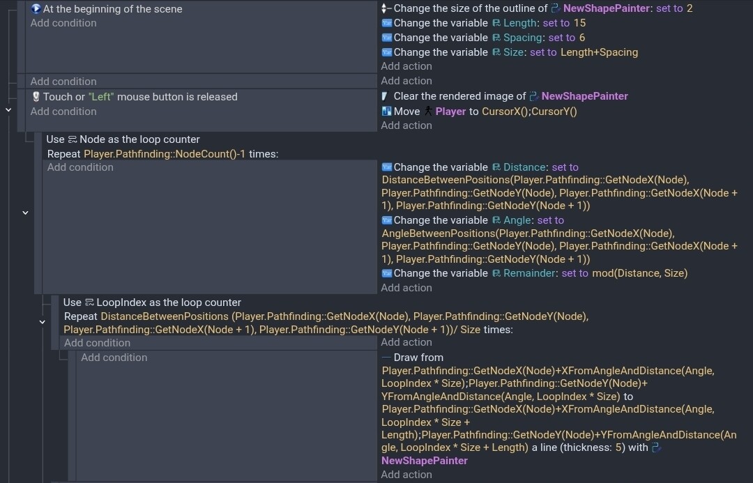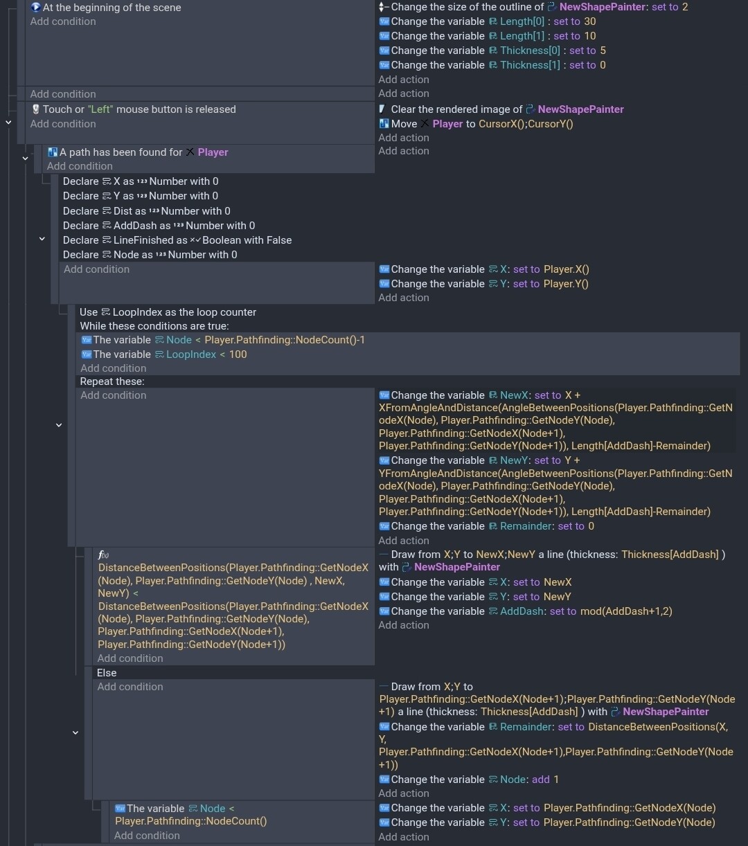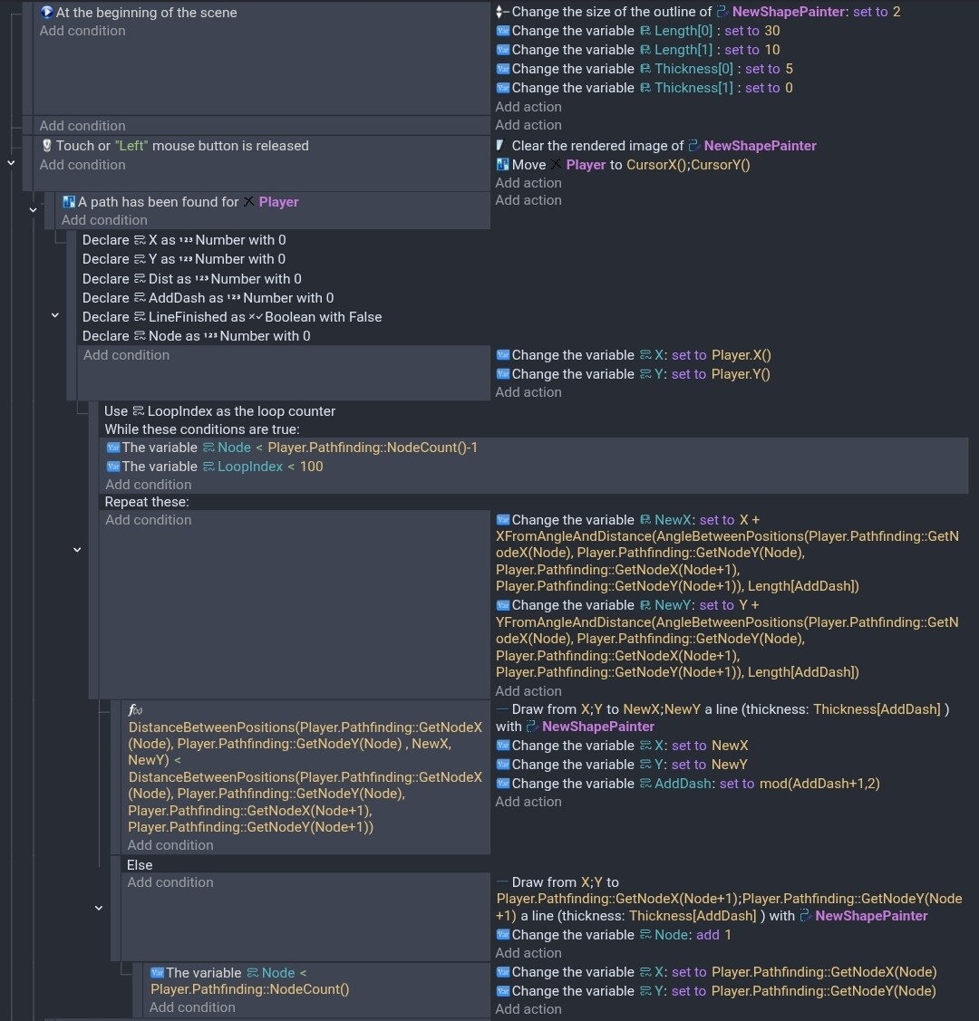 For testing, I decide to start with a single line going from a start to an end object. It’ll be easy to switch to pathfinding. I should be able to use the else events to draw the other half of a dash or advance the current x, y for the gaps and switch to the next node.