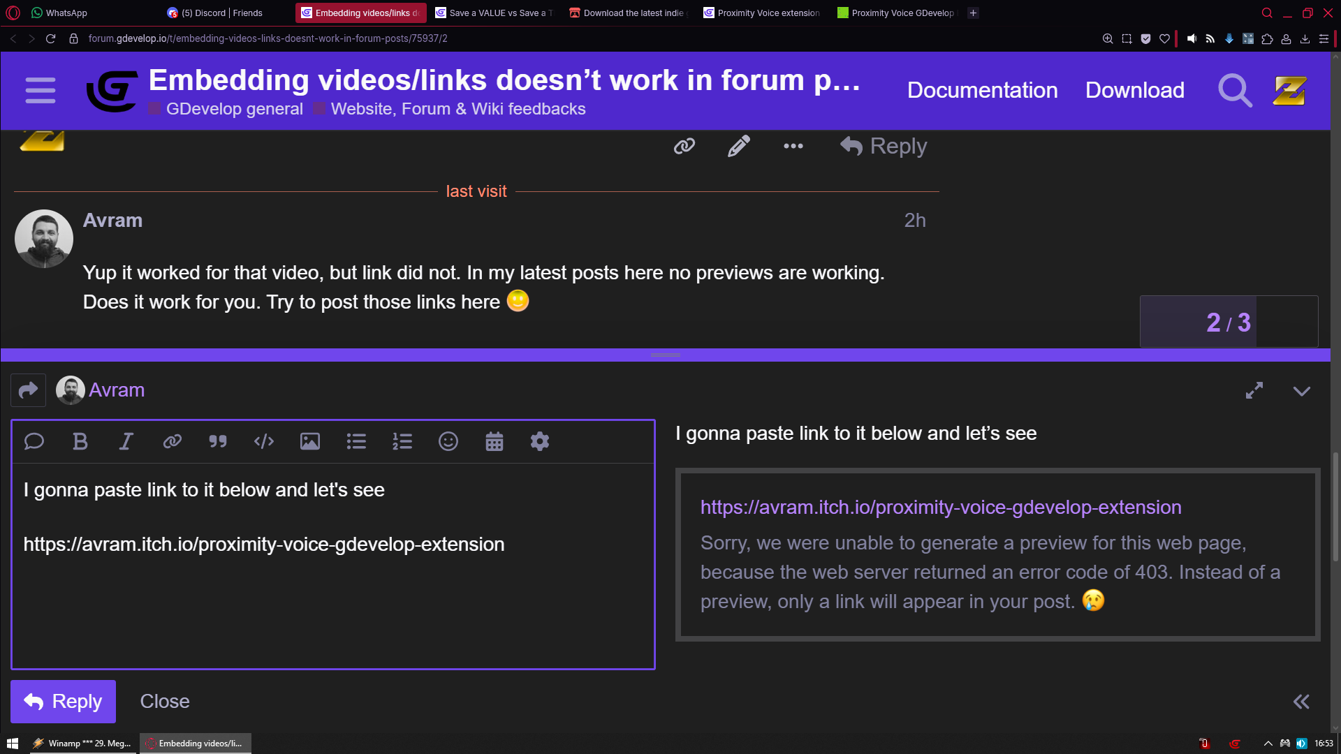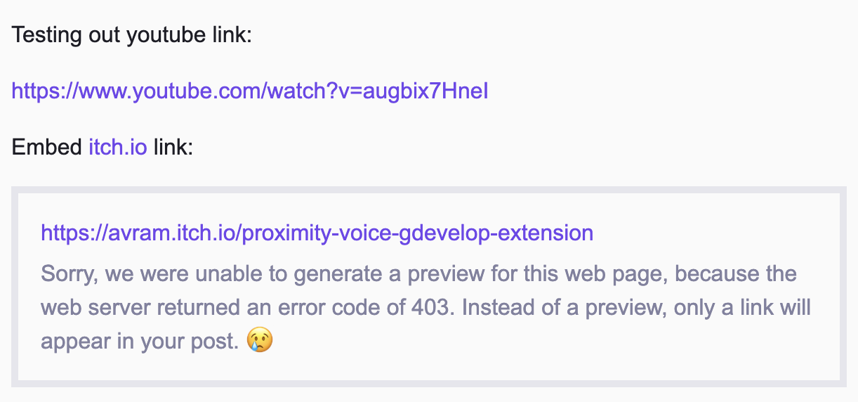 A 403 error is a web error specifically around Forbidden, so there is a chance that itch.io specifically disallows Discourse embeds, or Discourse doesn’t support the proper method to embed from itch.