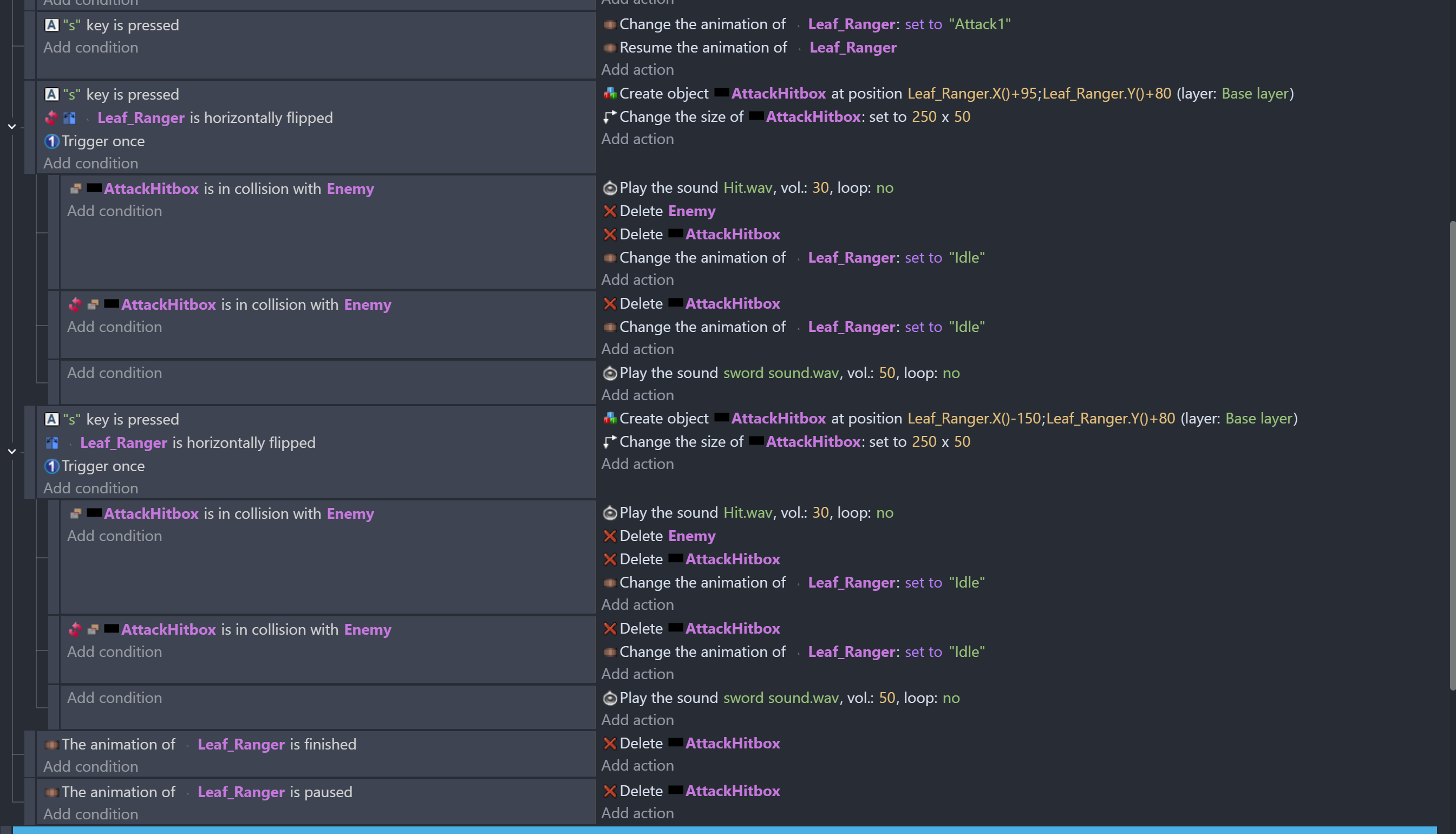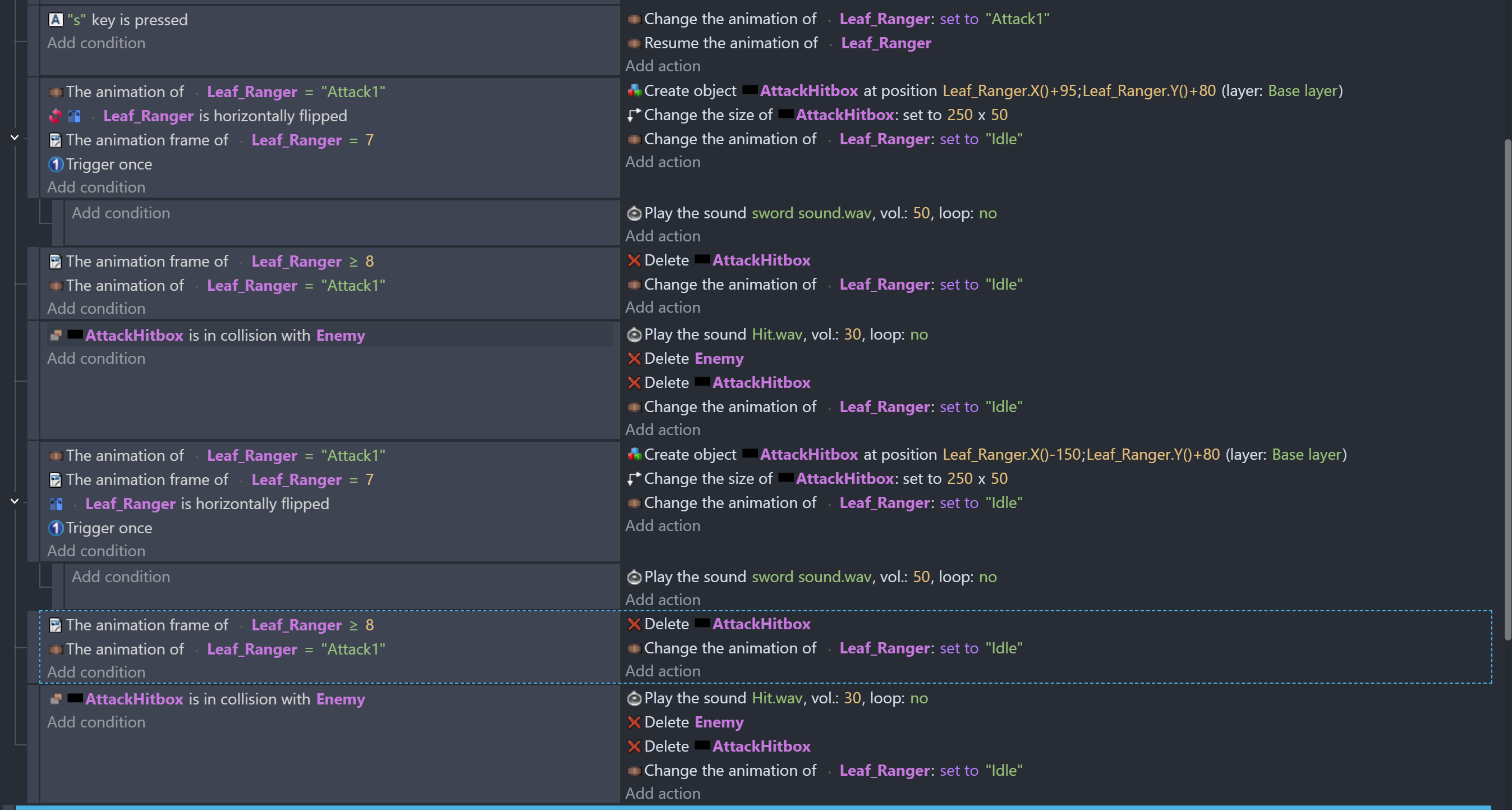 This is a tip. You have seperate events depending on if the object is flipped or not. You might be able to combine them into 1 process by adding a point on the object and placing a hitbox with a centered origin at that point. When an object is flipped, the points are also flipped. Changing the origin would make sure the object was placed at the same distance.