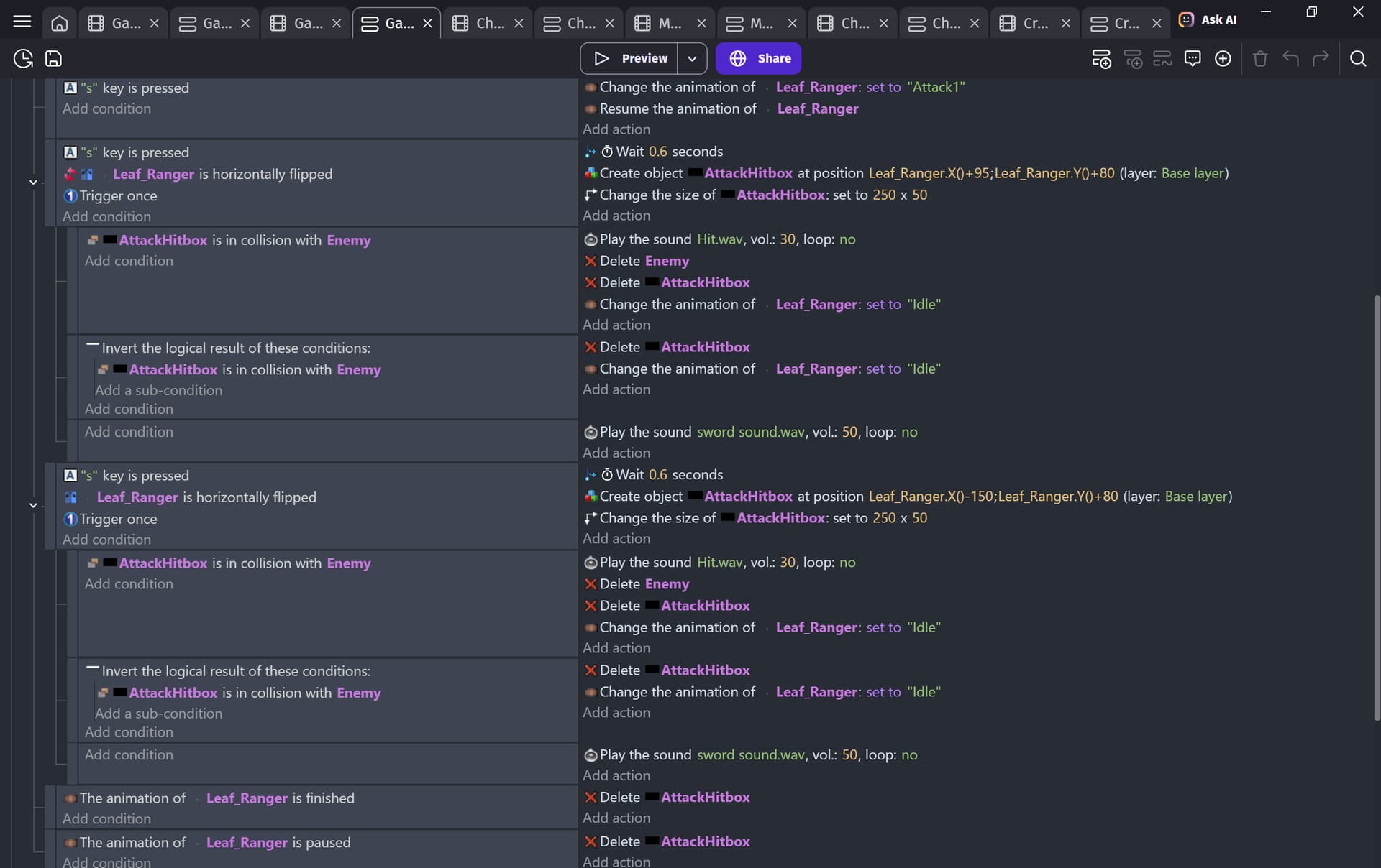 In my game preview, when I click s, the character does his animation but it doesn’t affect the enemy. I don’t even know if the hitbox is getting created.