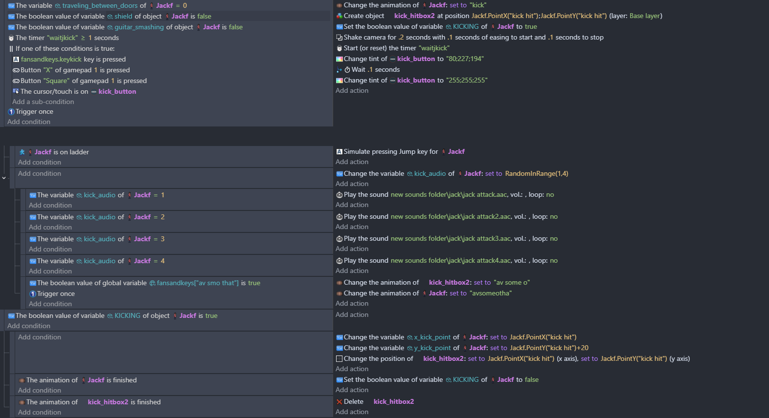In each of the enemy event groups there’s a is kicking true - if so check collision with kick hitbox