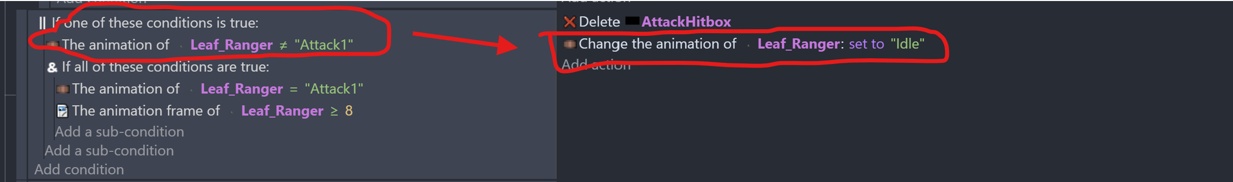 I think it’s because one of the condition is “The animation is not attack”, and the action is “Change animation to idle”