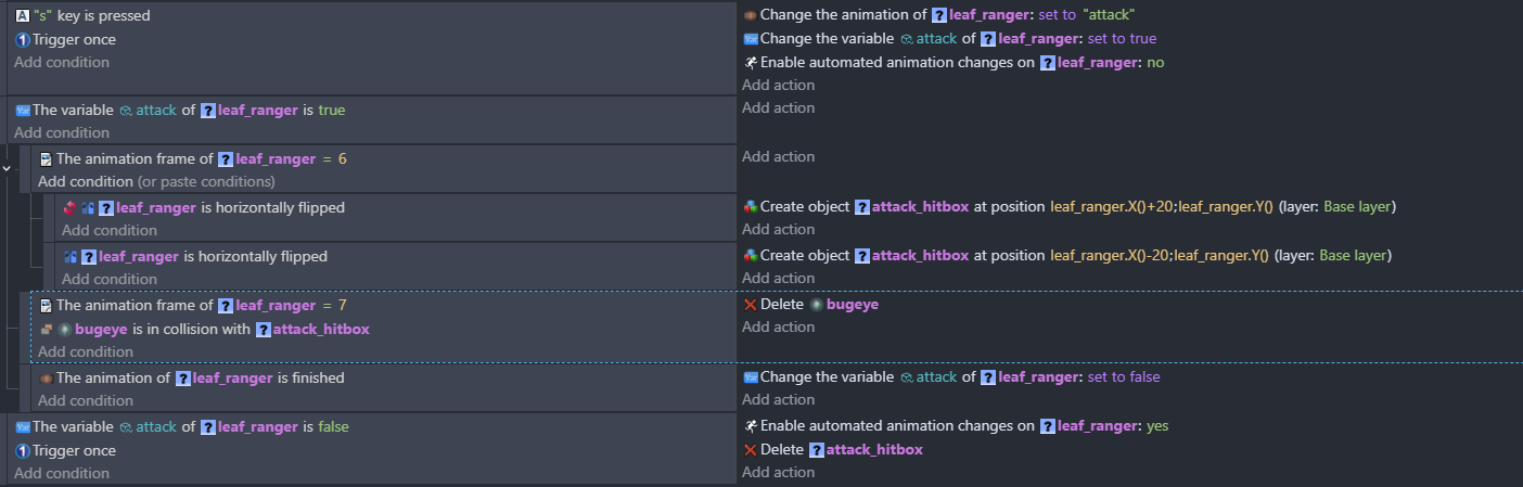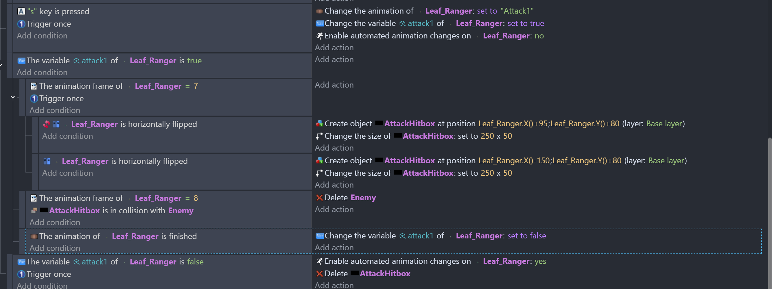 By the way - your attack collision could be an object that moves away from player for a few frames before deleting. If you create a point on player called ‘hitbox’ on frame 8 and create hitbox there, and apply a force at angle between player and point ‘hitbox’ then you wouldn’t need to check if it’s flipped and the hitbox could be visible with opacity 100 - might look nice