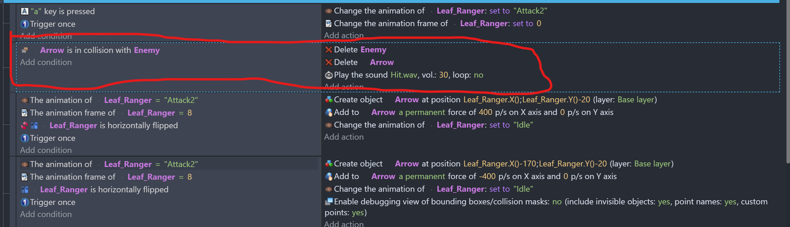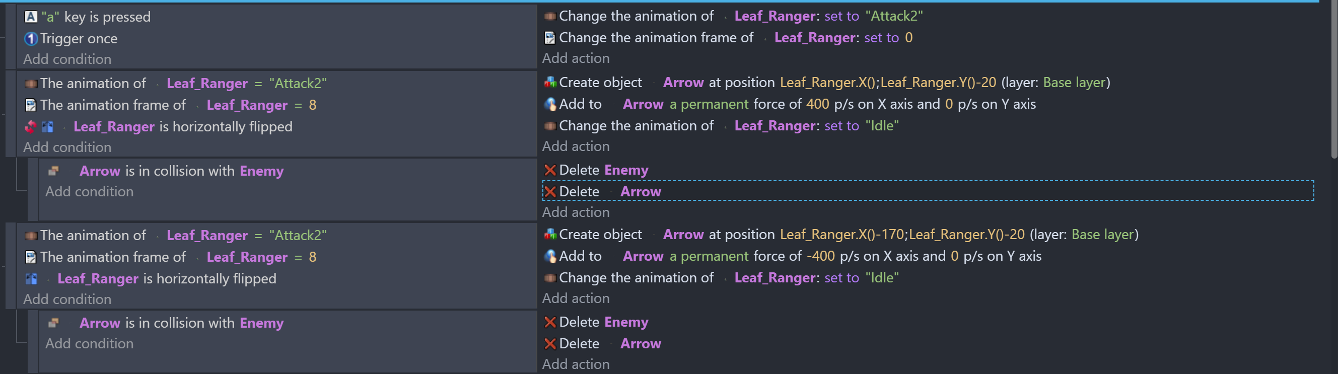 but that’s what you’re relying on there as frame 8 if attack …create and check collision and the very next event if frame 8 …change animation back to idle. Probably need a trigger once on the create arrow event.
