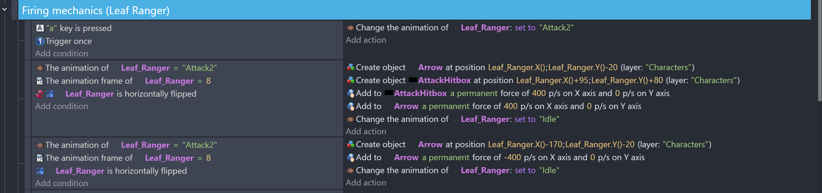 A have another set of events where the leaf ranger shoots an arrow out of his bow and the arrow changes its “x” every second. I want to integrate the hitbox too but it’s not working. In the preview, the ranger just shoots the arrow, and I don’t see the hitbox even getting created.