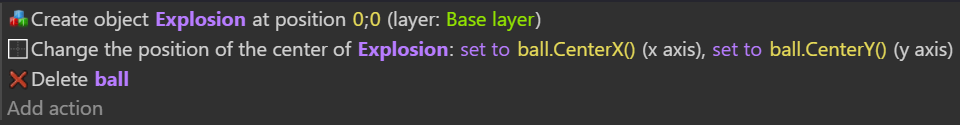 Did you move the Origin point of the explosion object to the middle? Otherwise, the top left corner of the explosion is placed on the center of the ball.