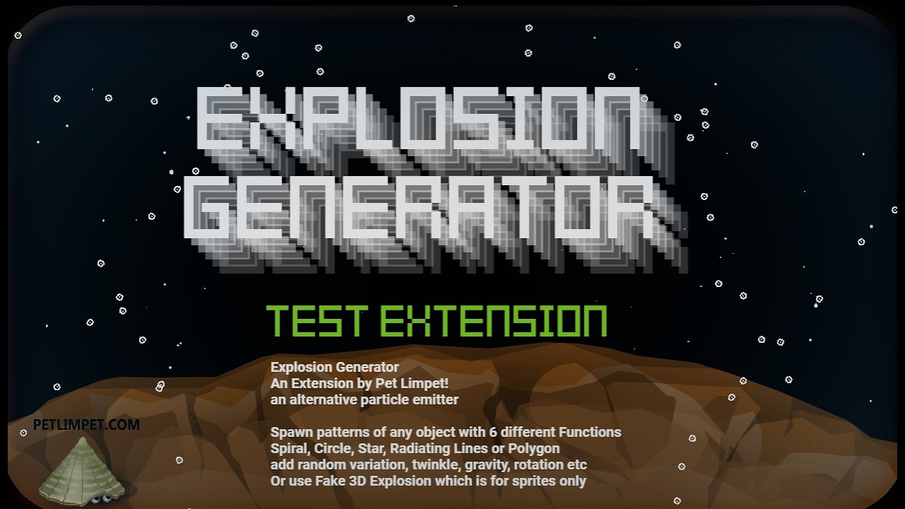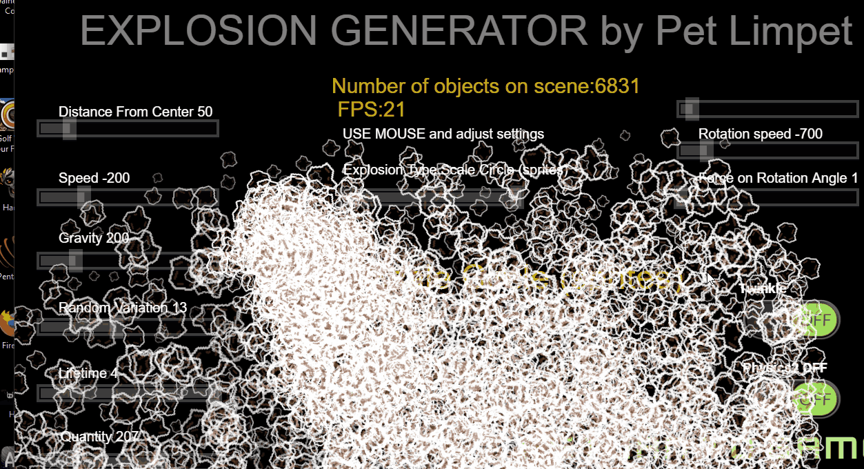 Initially i here i just wanted to create the sort of firework explosions that you had in the classic arcade game defender. So that’s what i did and create a ring of objects with a velocity from center that decreases to 0 with gravity at an angle that you can set. It can be attached to any object including 3d and so I couldn’t refer to scale or opacity and so i added twinkle as you can use hide/show