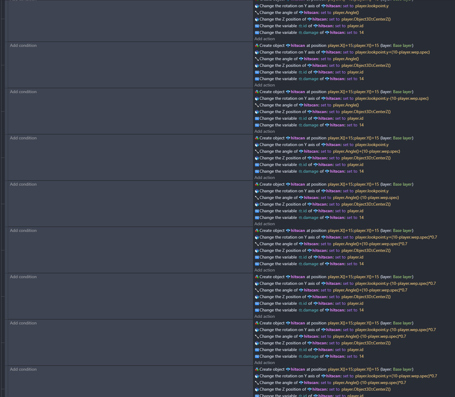 So instead of adding 8 actions of “this goes 15° left; this goes 10° left; this goes 5°…” and so on, I just can add “shoot 8 times, but every time bullet goes slightly right”