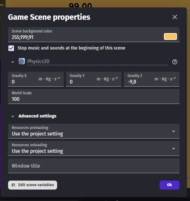 Also, if you want the game to unload unnecessary resources from one scene to another, open the scene properties, toggle the advanced settings, and adjust these options as needed.