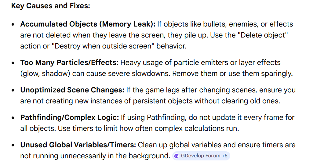 Hi! I’ve fixed every error in the console now it runs great, no lag whatsoever. But only in gdevelop preview, I exported it again .aab file since im on closed testing in play store. Still, it lags after every new area. Im so confused