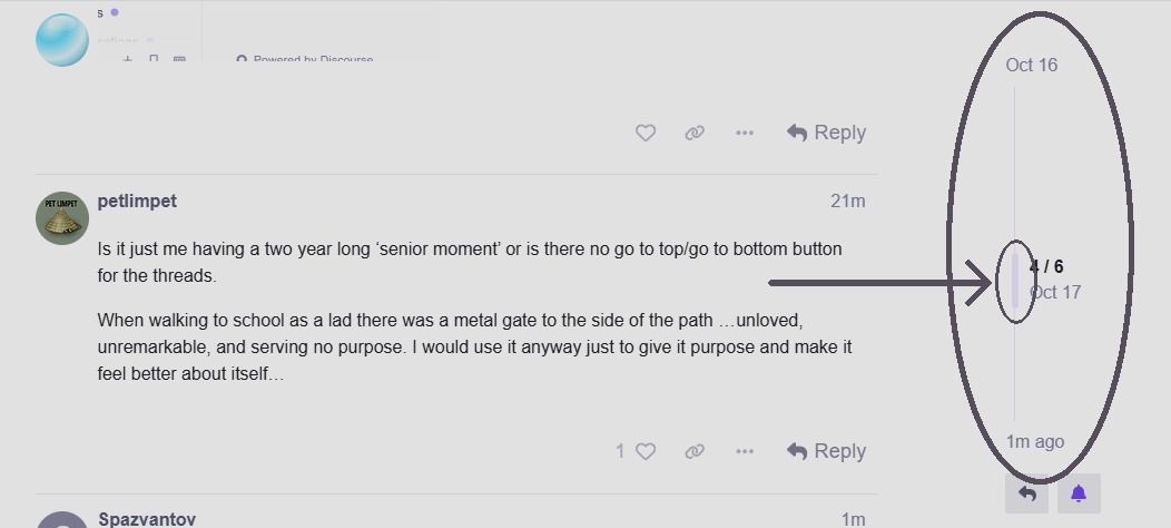 Is it just me having a two year long ‘senior moment’ or is there no go to top/go to bottom button for the threads.