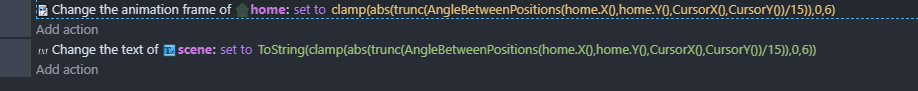 I still haven’t tried creating actual results since I am stuck at the event sheet on finding the right conditions on how to check the angle generated. So far my progress is that I created a scene variable in which there will I store the angle and later on use that variable to compare it to a set of ranges of angles which have a correspoding sprite frame if satisfied.