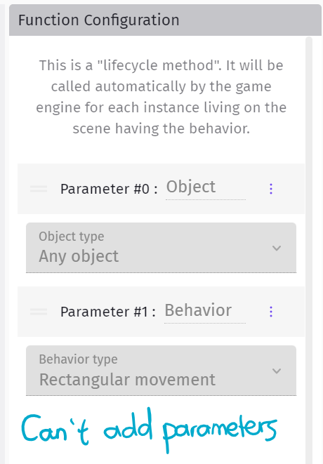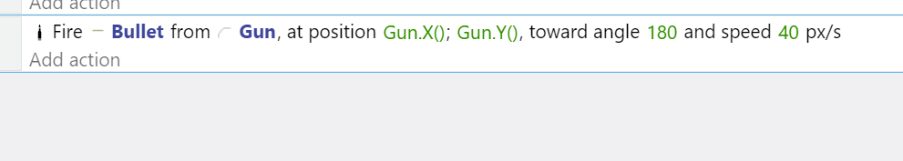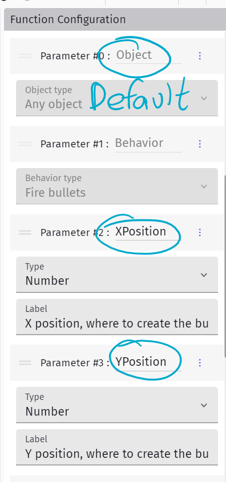 The events in the function are where you define what you want to happen for that action. The Fire Bullet behavior has a Fire function where it creates an action using x and y position, angle, speed etc. These values in a function are called parameters. Every function has a default Object parameter. This is the object that the behavior is added to. Here are some of the Fire parameters, each one has a name, type and label.