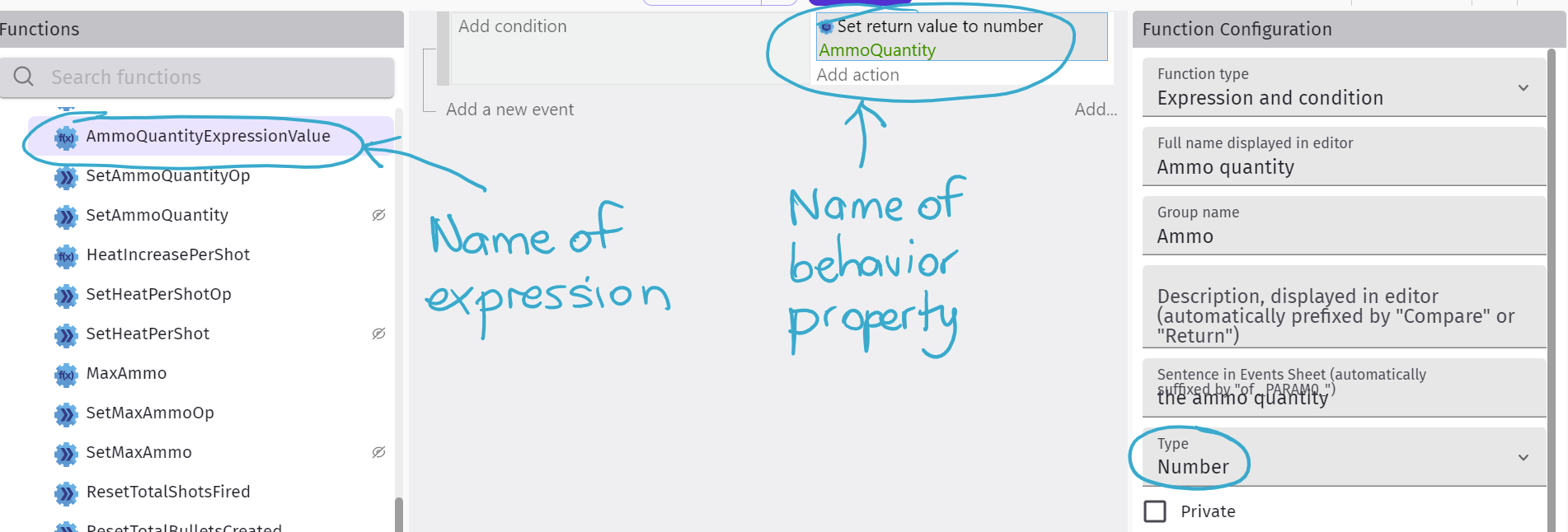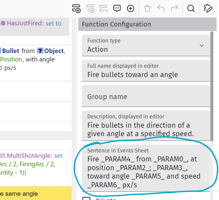 _PARAM2_ and make a meaningful sentence so that it makes sense in the event sheet. Here’s what the Fire parameter sentence looks like in the function and how it looks like in the scene events action.