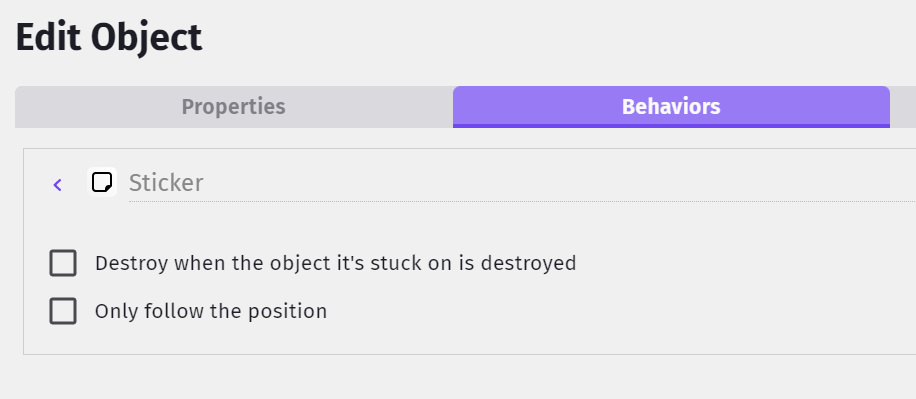 The Sticker behavior has two settings, Destroy when the object it’s stuck to is destroyed and Only follow position.