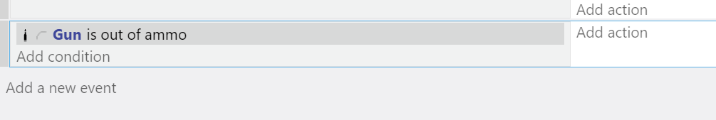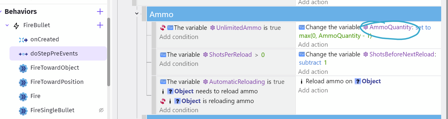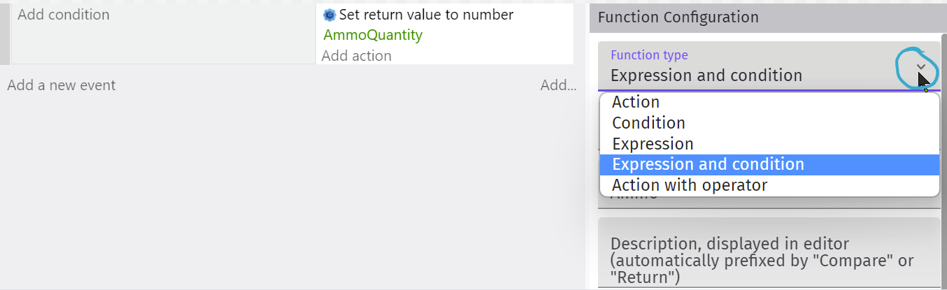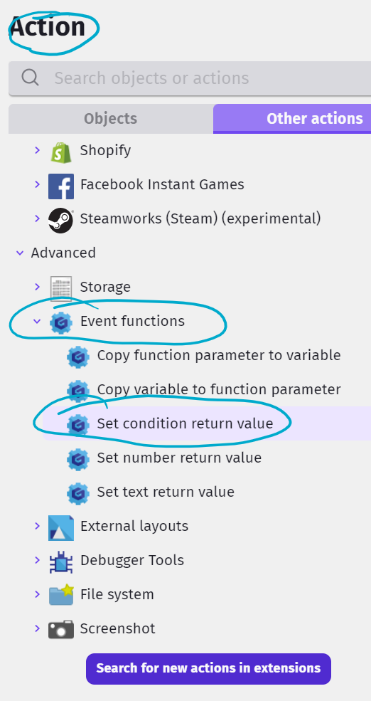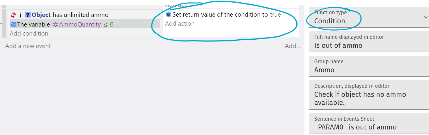 But what if you want the extension user to check something? For example, in the Fire Bullet extension, it makes sense to check if there is any ammo left. It does this with a function called IsOutOfAmmo. This function is a condition function. And because a condition checks whether something is true, you will need to have a condition. But what do you have in the action? This is where you give the function a result, is it true? To do this you go to Event functions and select Set condition return value.