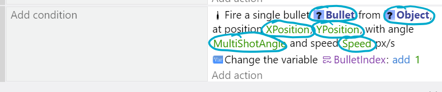And here is an event in the Fire function using some of these parameters and others as well. All the names in the green circles are parameters.