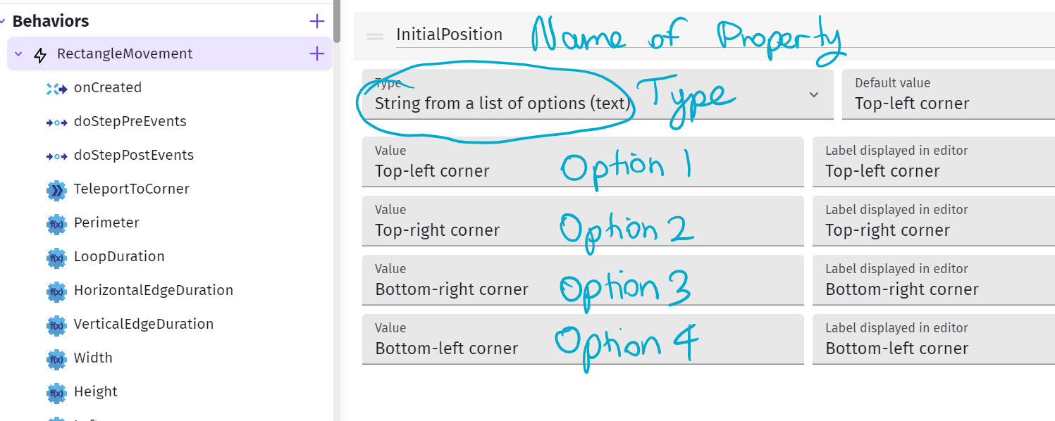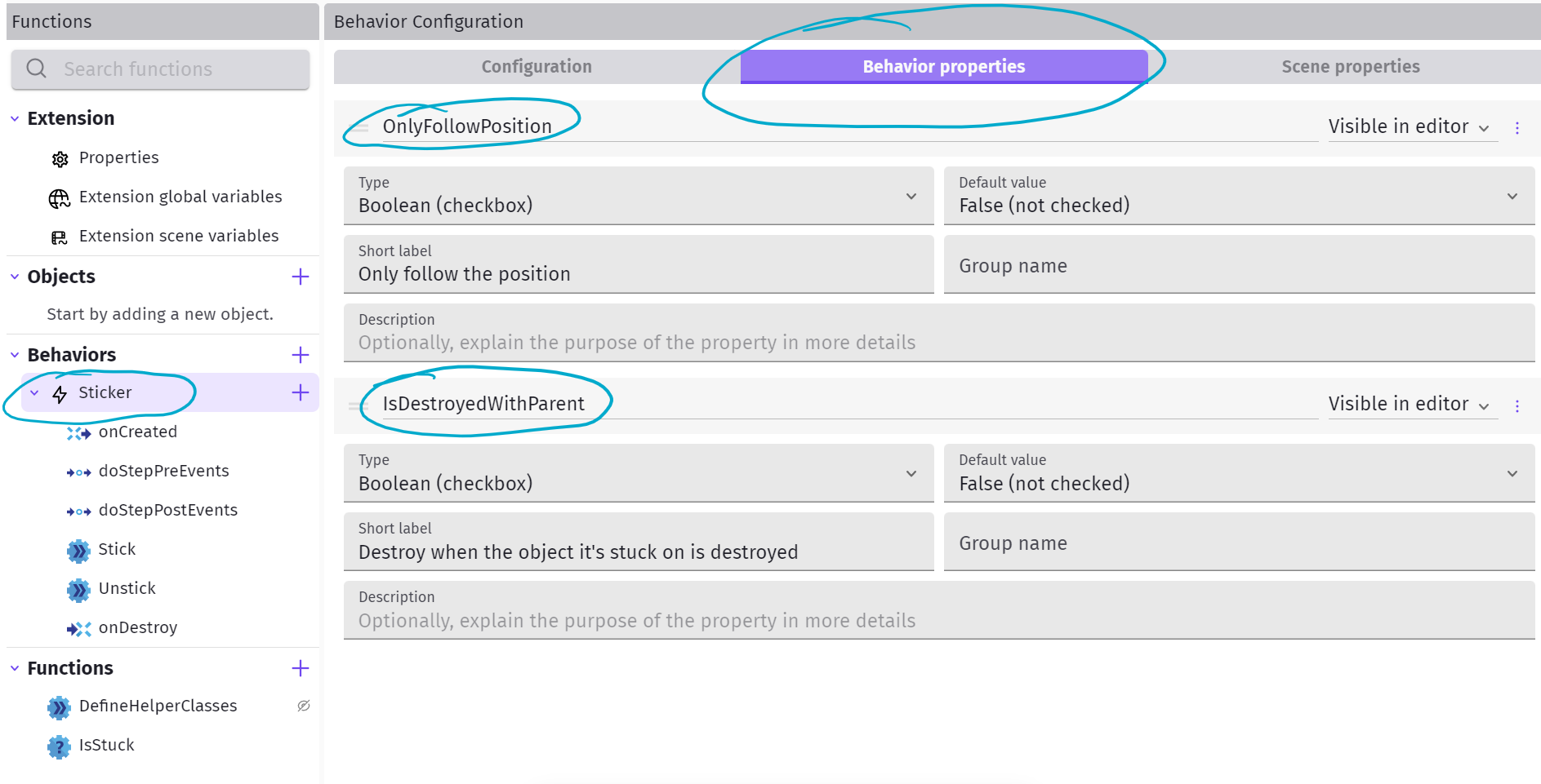 If you click on the name of your behavior, a new window will appear, one of the tabs is for Behavior Properties. This is where you’ll add your settings. Both the Sticker properties are Boolean variables.