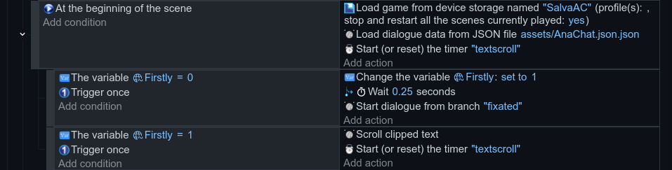 I mean, when I re-enter my game, the chat no longer loads for some reason. At the beginning of the scene, it activates a variable that happens only once and goes to the initial branch, but when I load the game (after exiting and returning), the options disappear and the dialogue stops running.