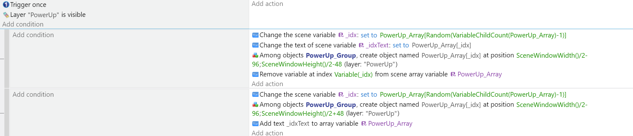 This is my code for generating powerups, where two are randomly selected from the array.